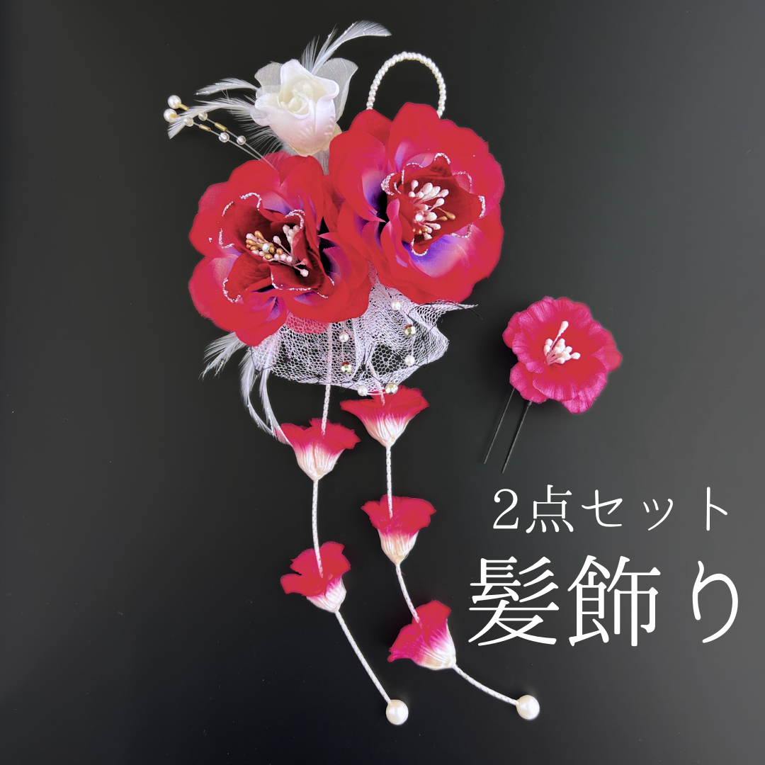 落ち着いた赤色の花びらの先に、ラメが施されていて豪華な髪飾り