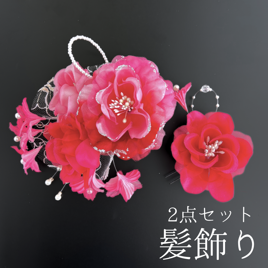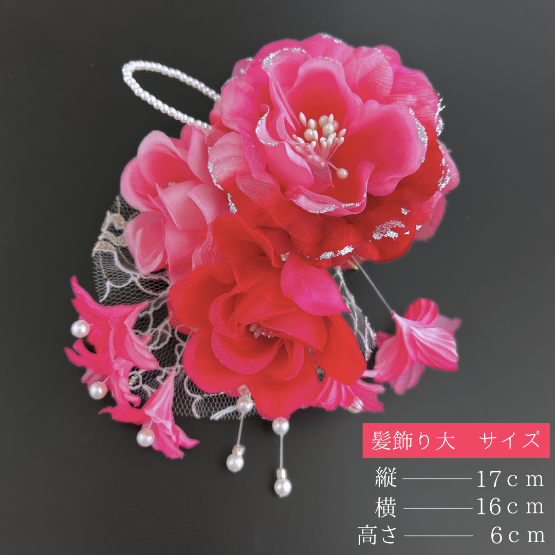 鮮やかなピンクと赤の花飾りで、お顔周りが華やかに!
