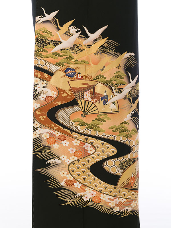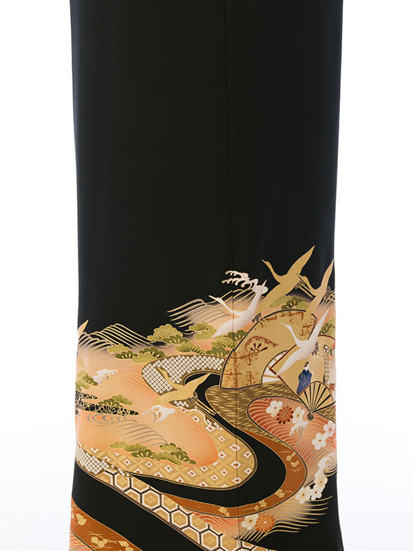 黒留袖: ベージュ/茶扇流水飛び鶴