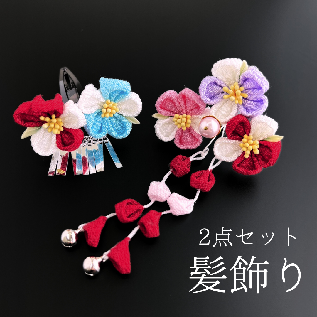 ちりめん生地の繊細なつまみ細工が、お子様の晴れ着姿を引き立てます。