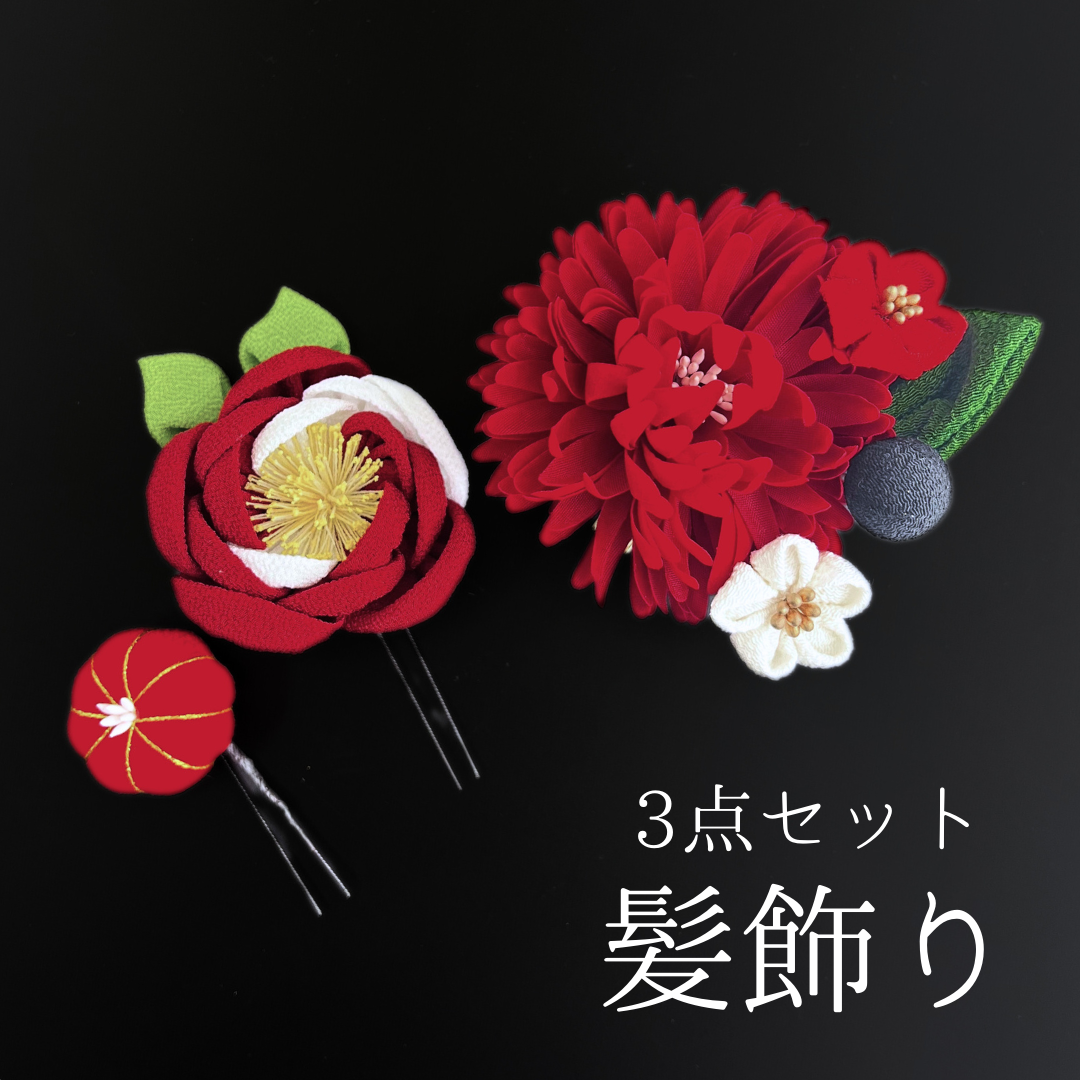 大きな菊と、ちりめん生地の椿がレトロな雰囲気の髪飾りです。