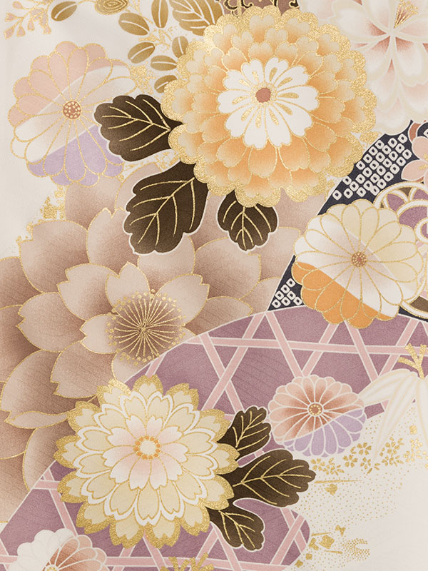 ■着物:白地 地紋 四季花に古典柄 金彩
