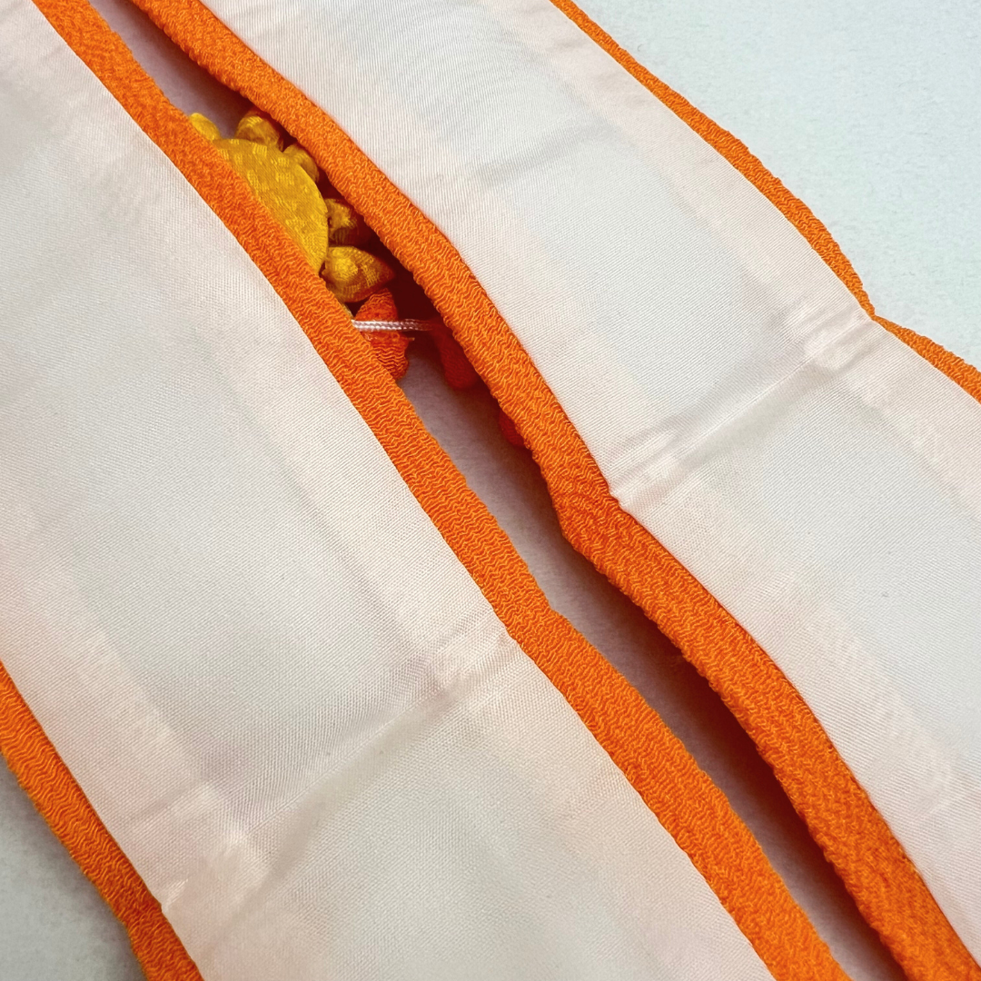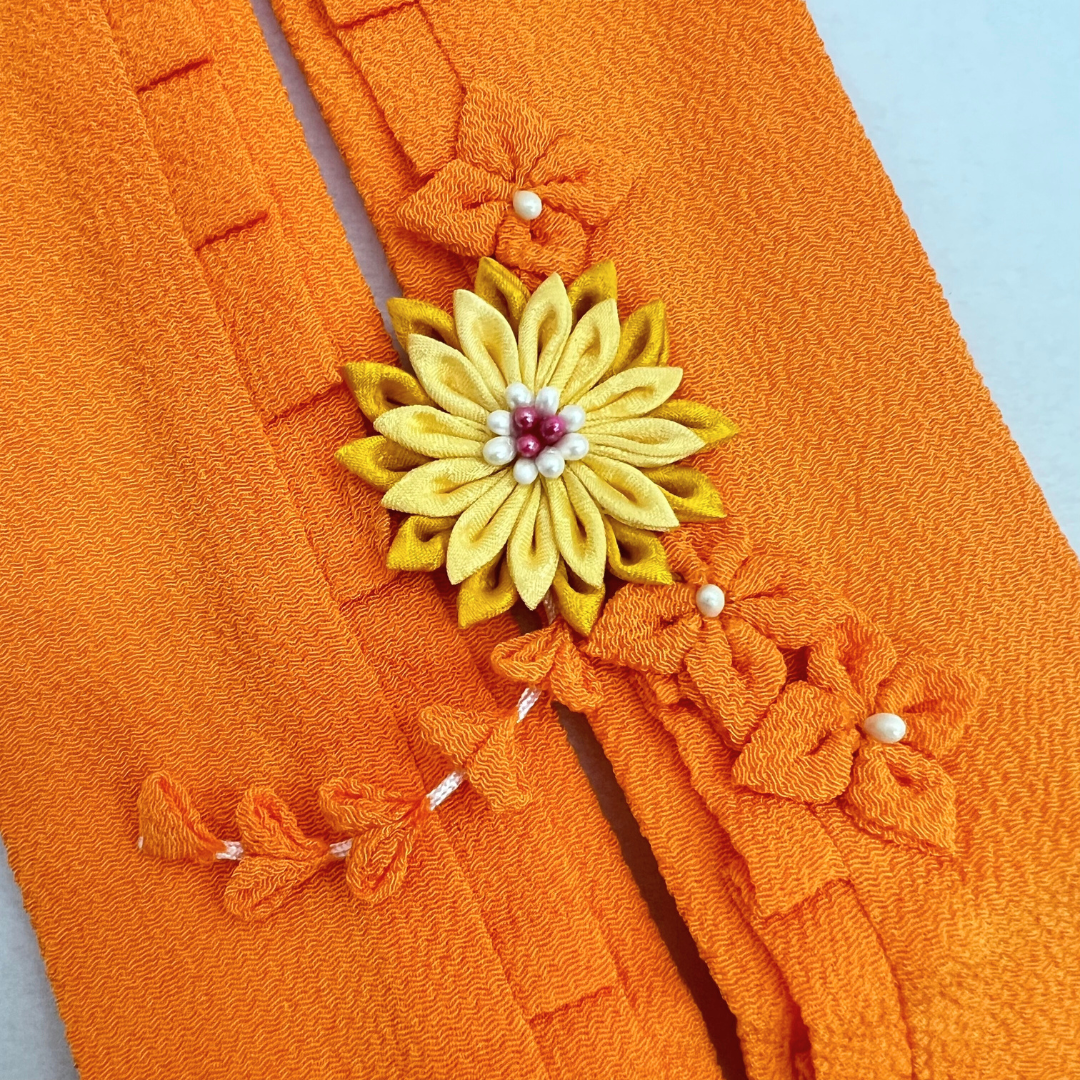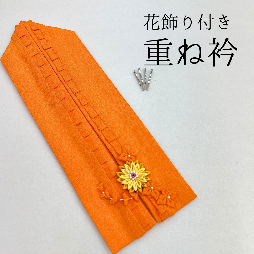 鮮やかなオレンジ色で、お顔周りが華やかに!花飾りがワンポイントで豪華な重ね衿です。