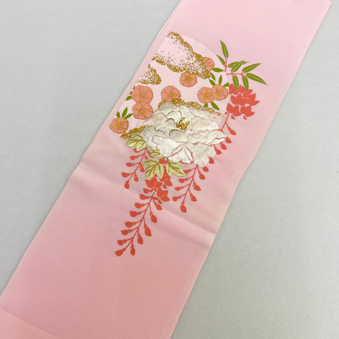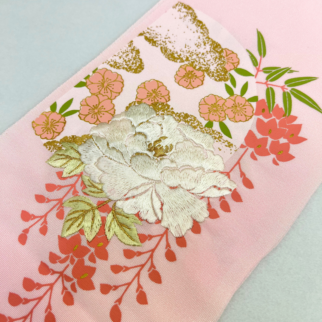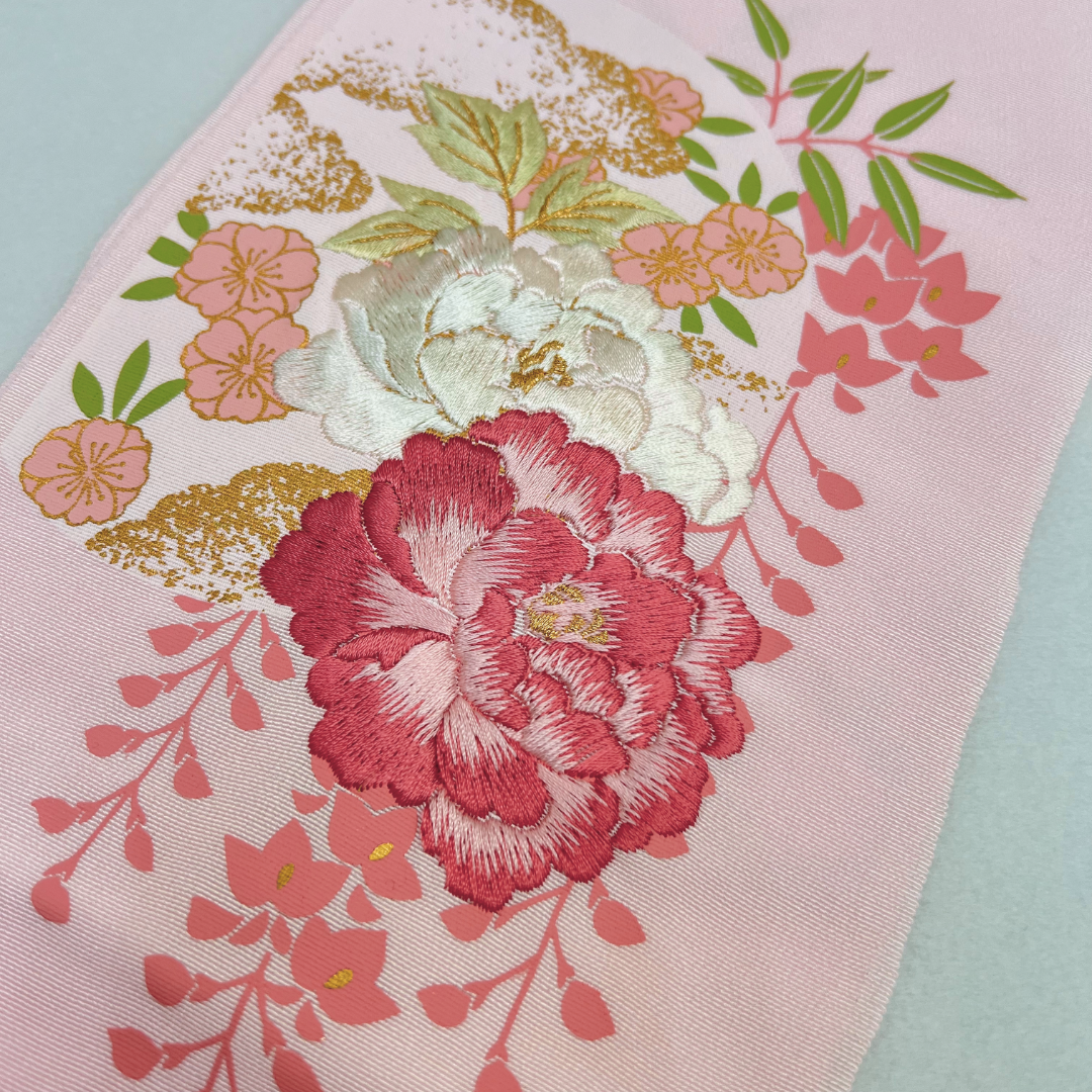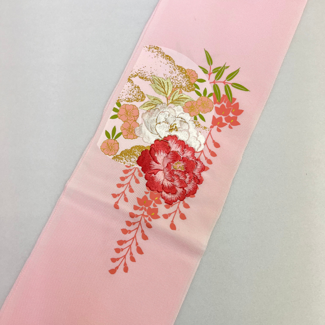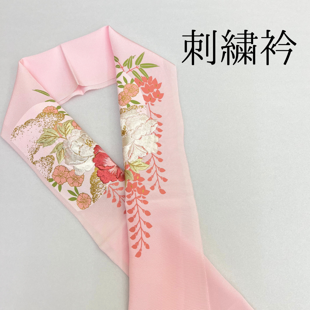淡いピンクで優しい雰囲気の刺?衿です。古典花の刺?で豪華さアップ!ブライダルにもご使用頂けるよう、寸法が長めになっております。