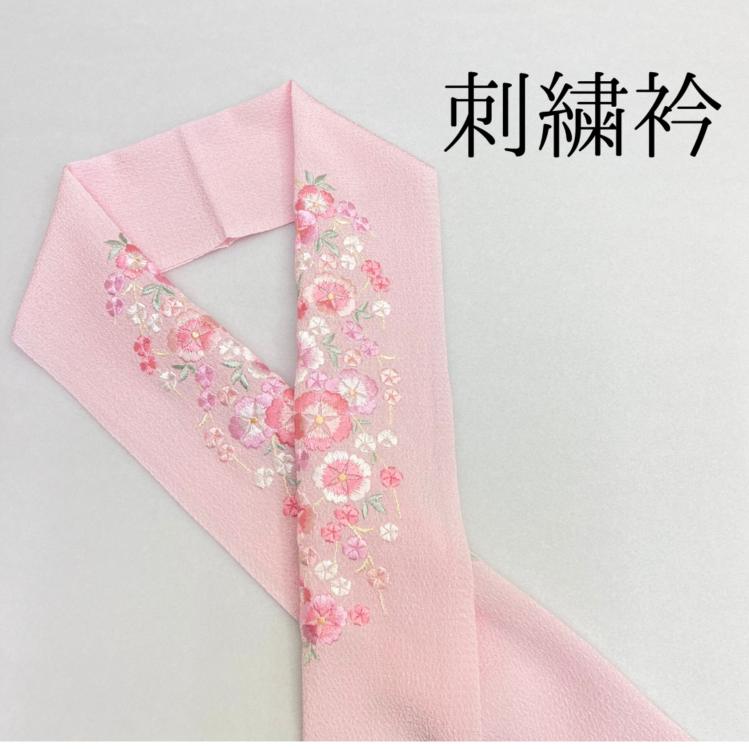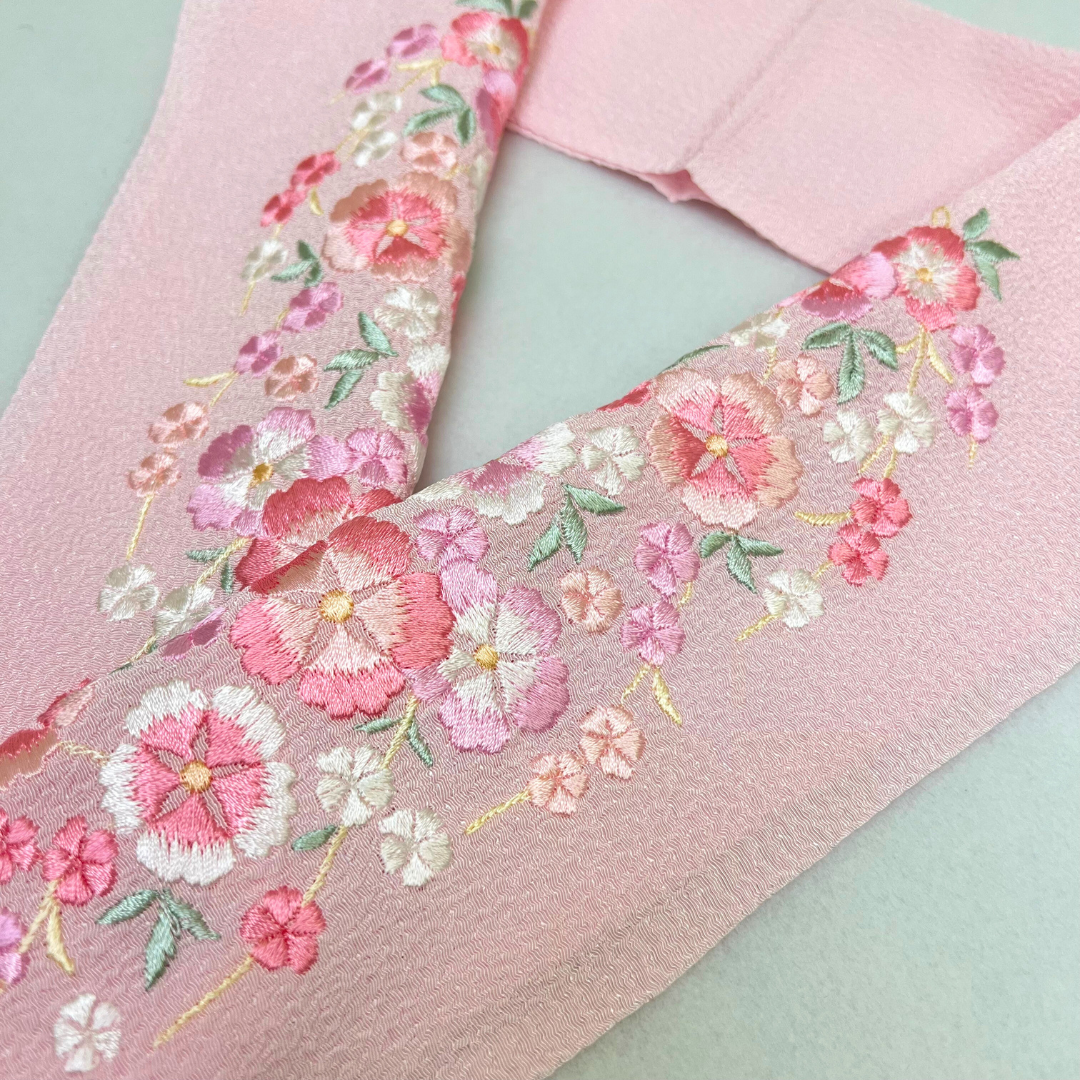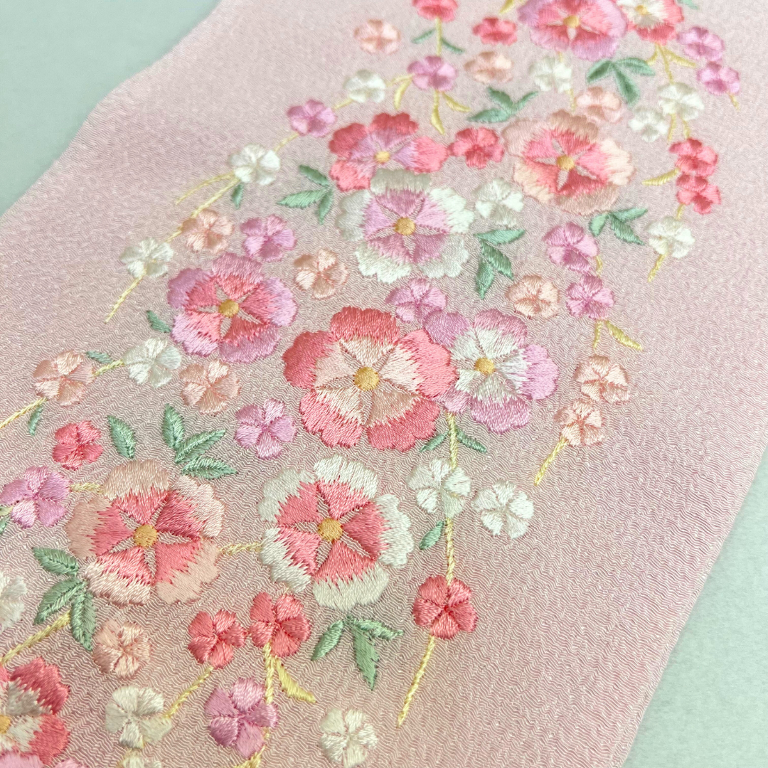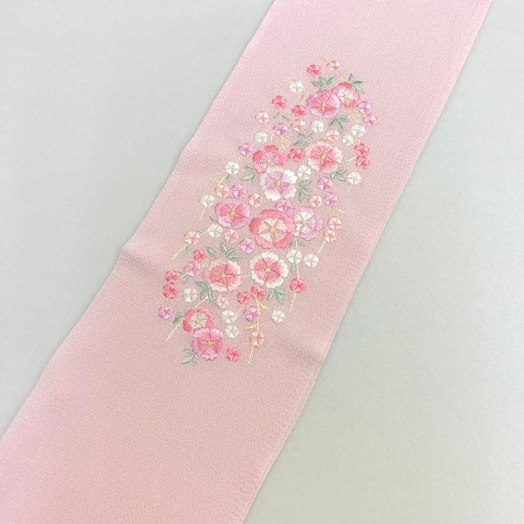 淡いピンクに花柄刺繍が可愛らしい印象に!幅広い着物コーデに合わせやすい、シンプルなデザインです。