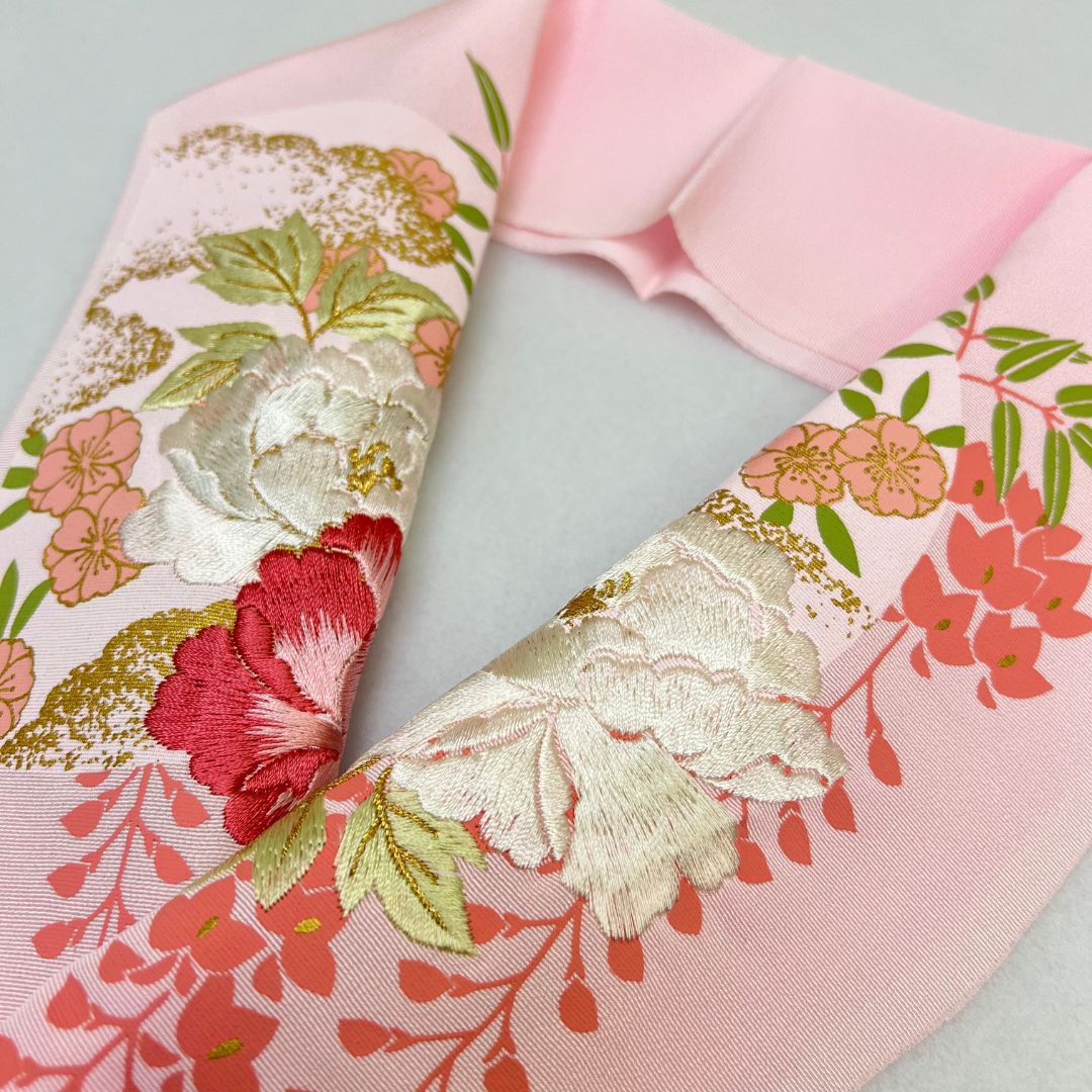 淡いピンクで優しい雰囲気な刺?衿です。古典花の刺?が豪華さアップ!ブライダルにもご使用頂けるよう、寸法が長めになっております。