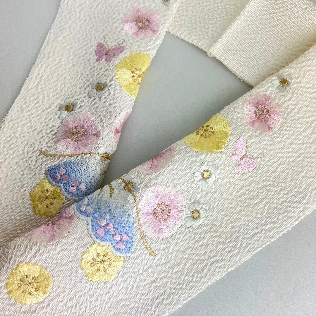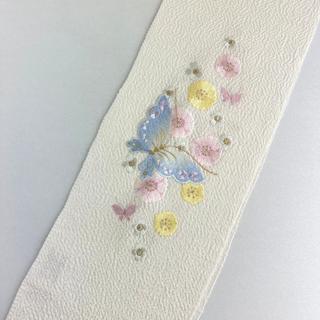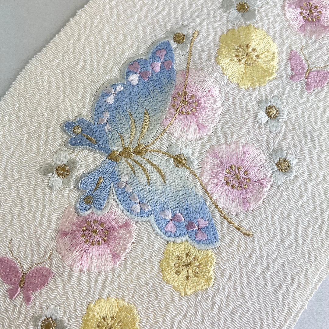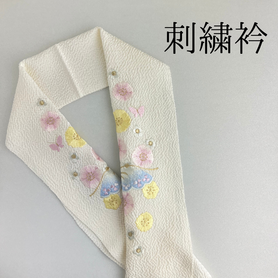 蝶と八重桜が可愛らしい刺繍衿です。全体的に淡い色なので、優しい雰囲気にピッタリ!