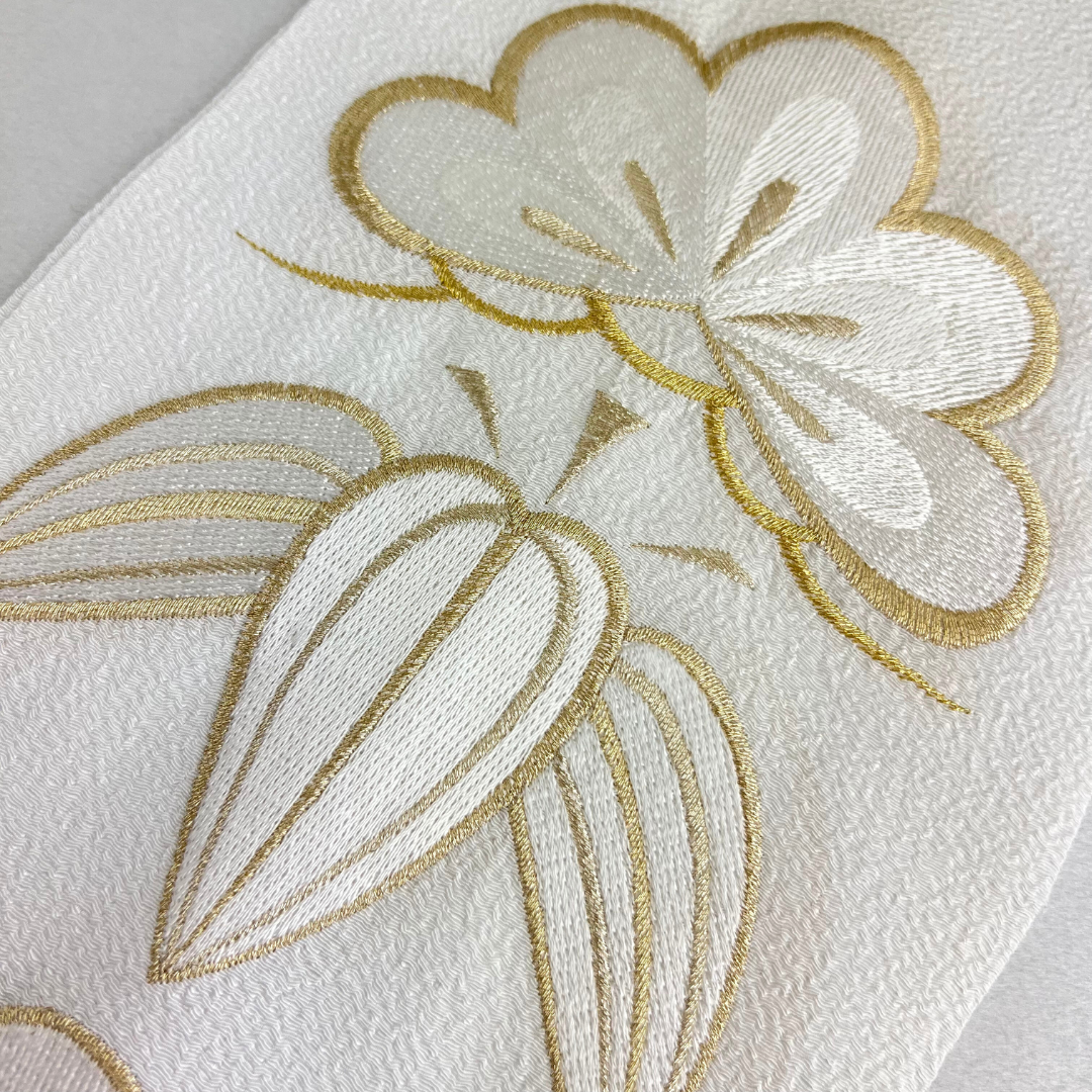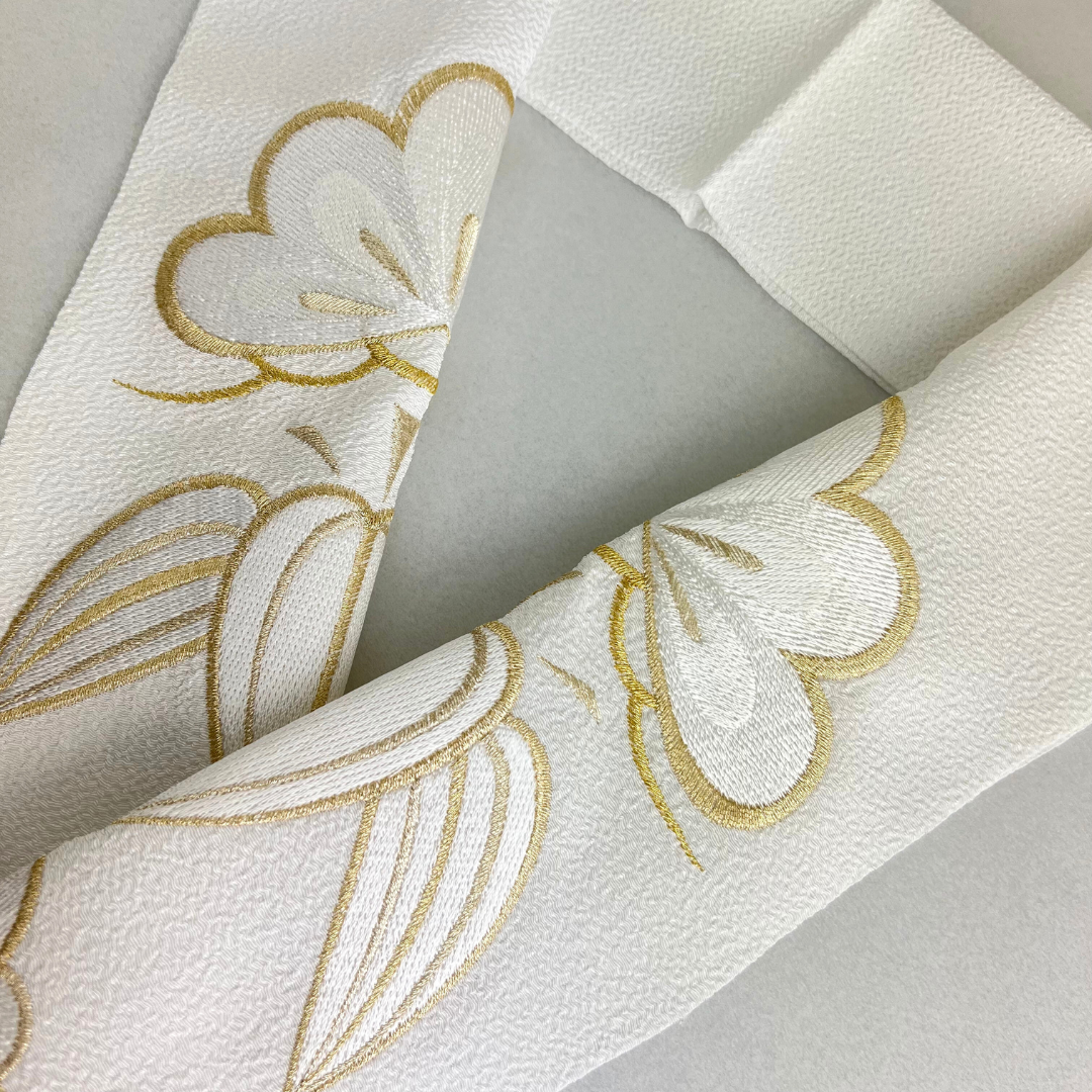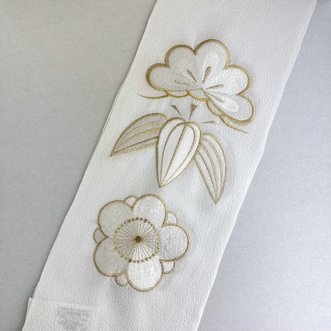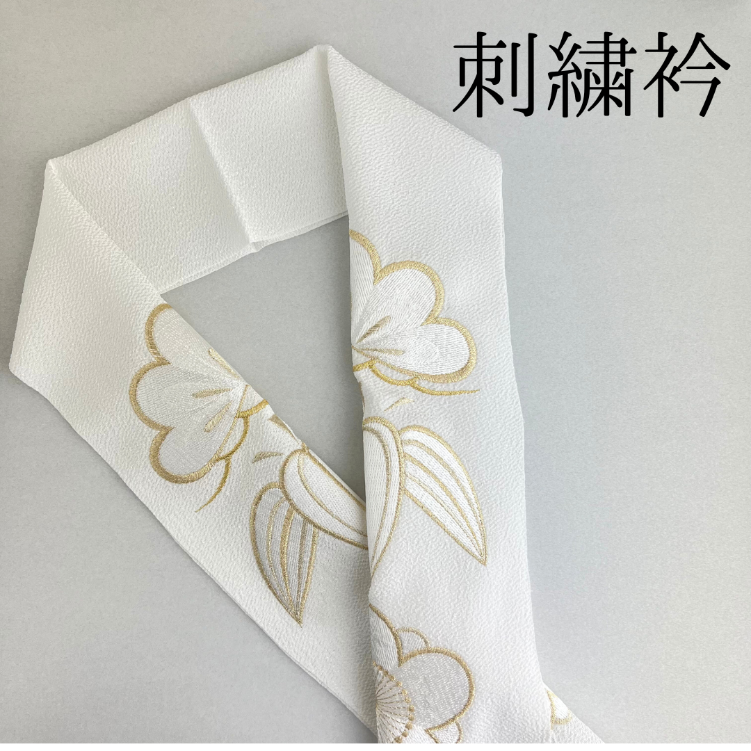 ゴールドと白色の松竹梅の刺繍が上品で豪華な刺?衿です。ブライダルにもご使用頂けるよう、寸法が長めになっております。