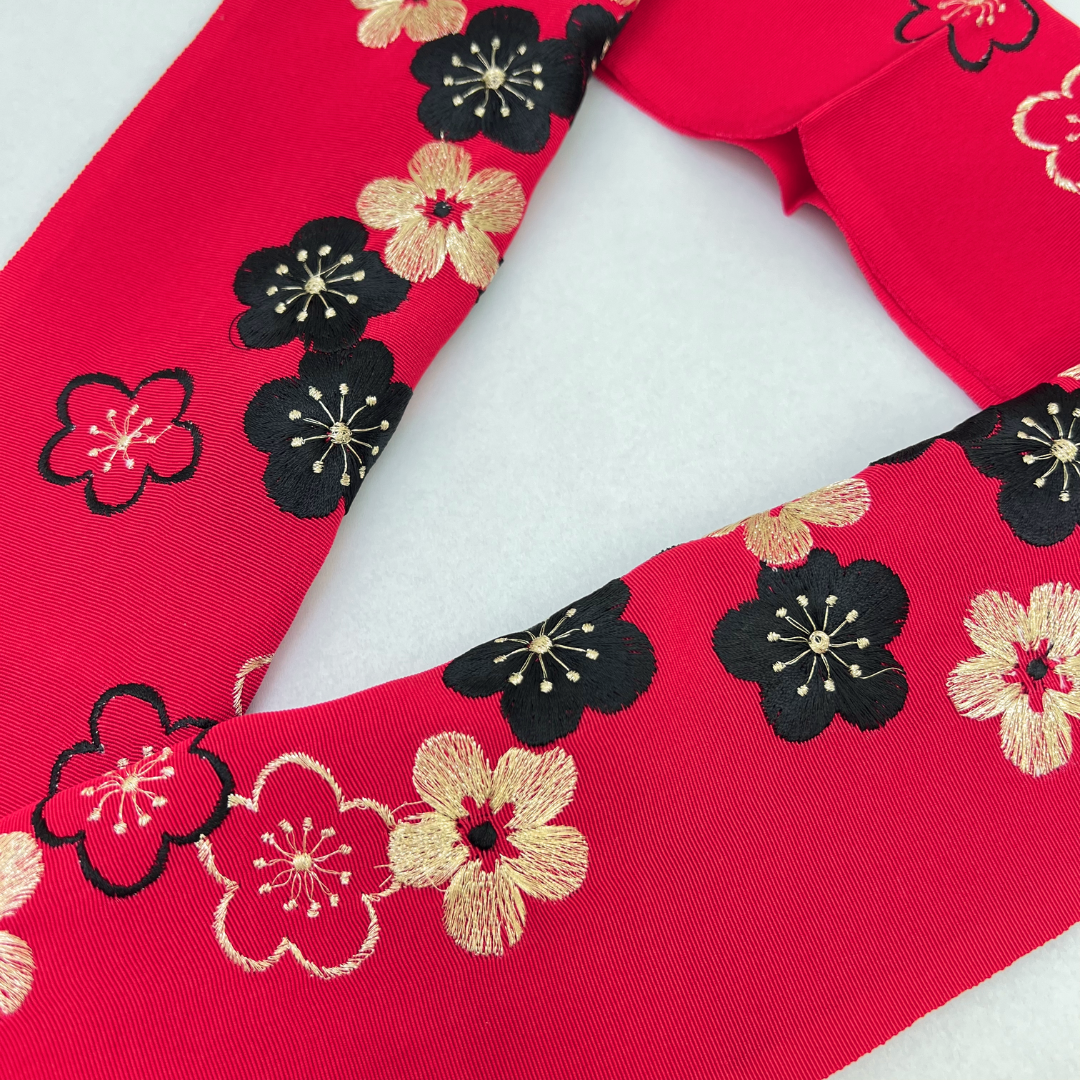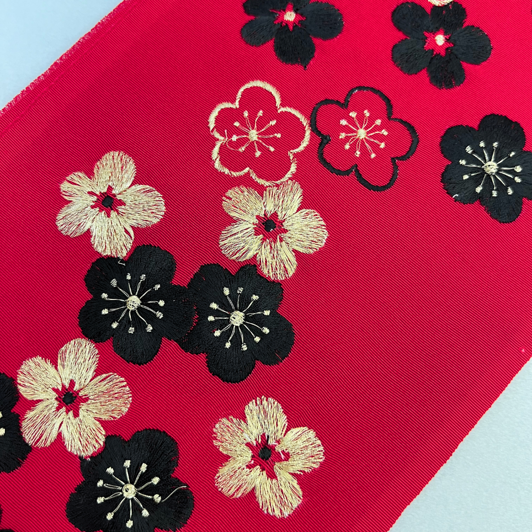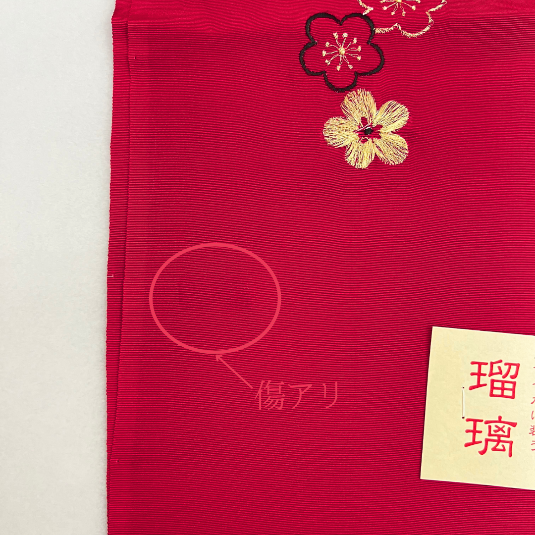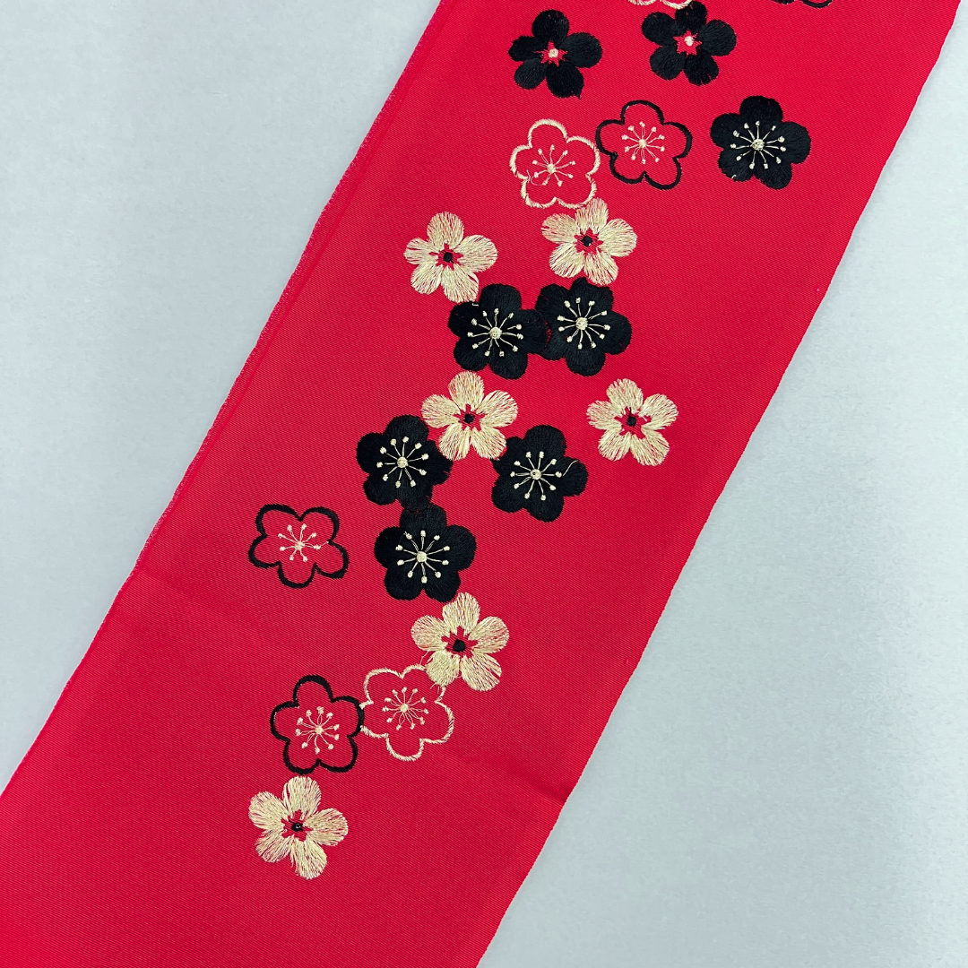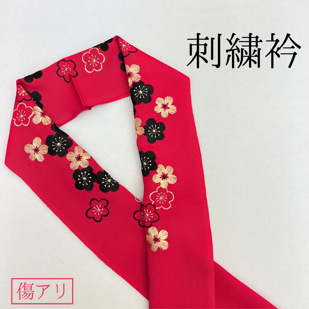 ゴールドと黒色の梅の刺繍が豪華な刺?衿です。鮮やかな赤なので、お顔周りが華やかに!