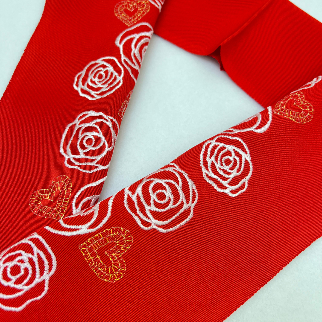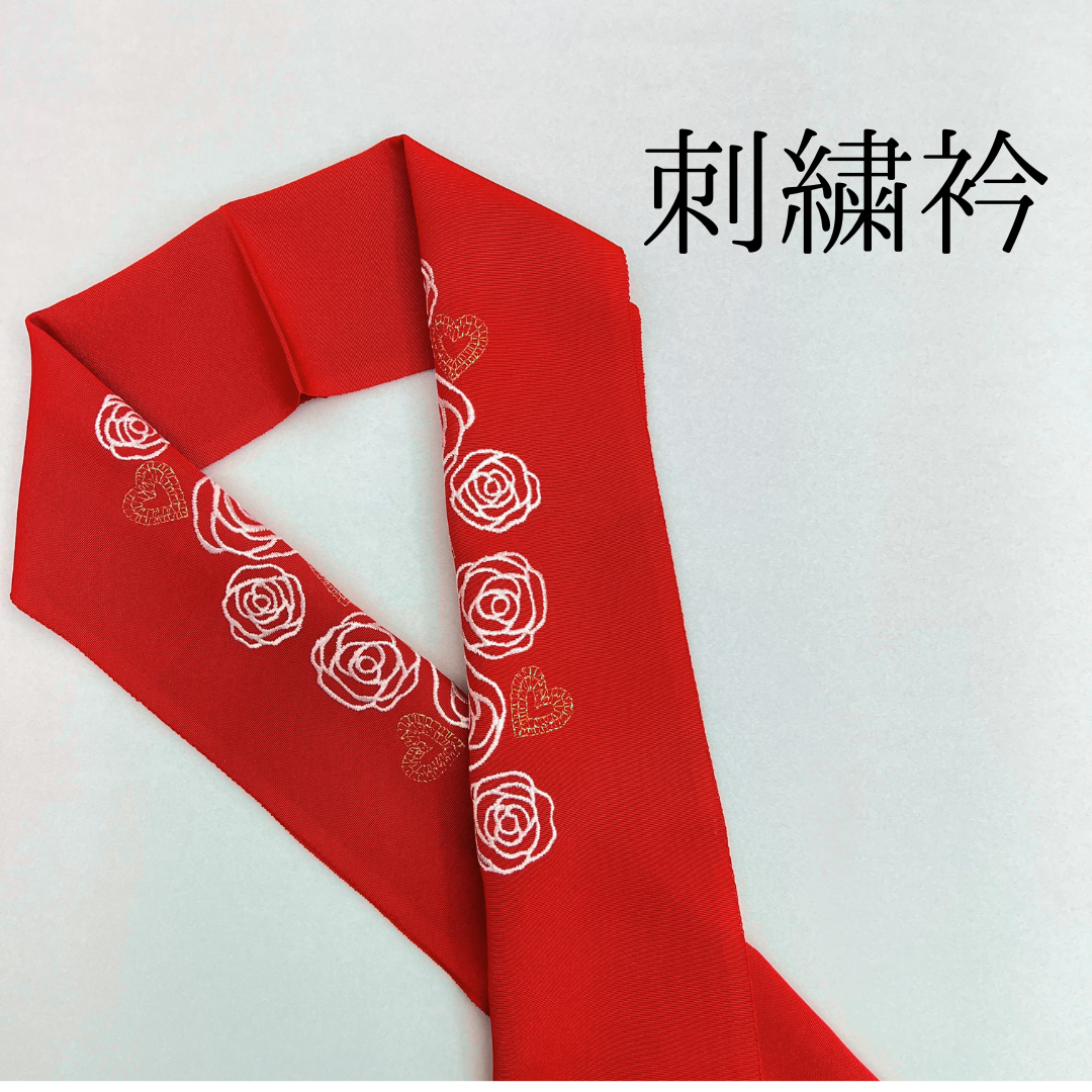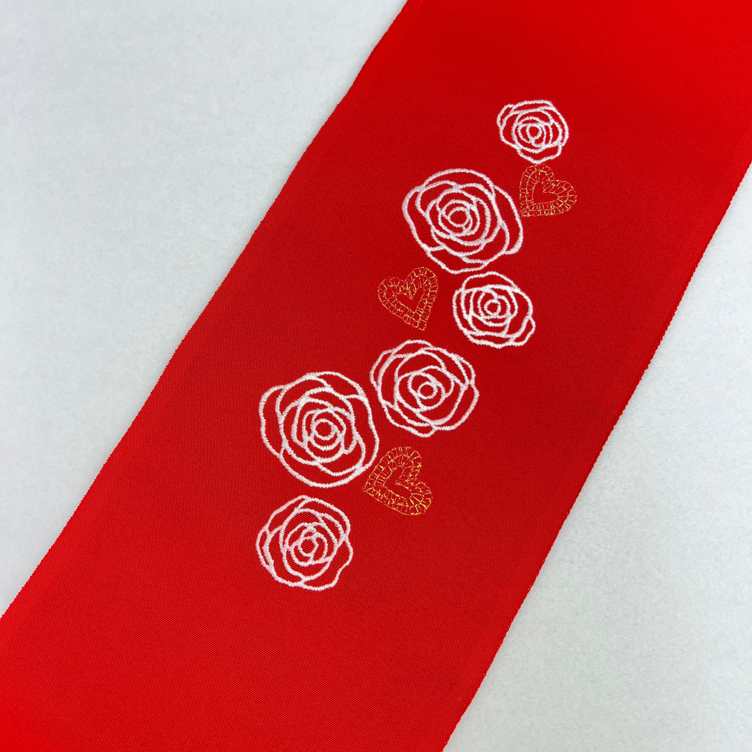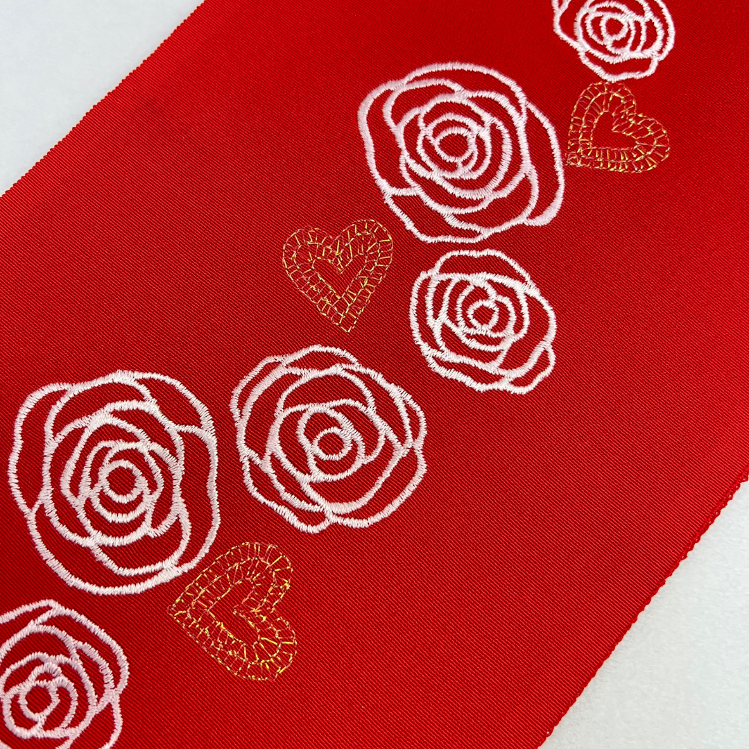 鮮やかな赤なので、お顔周りが華やかに!バラとハートの刺繍がキュートな雰囲気にピッタリです。