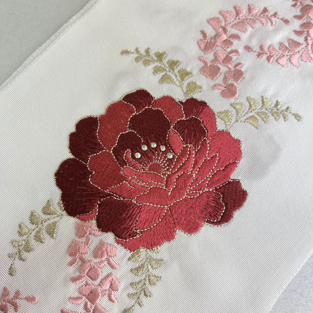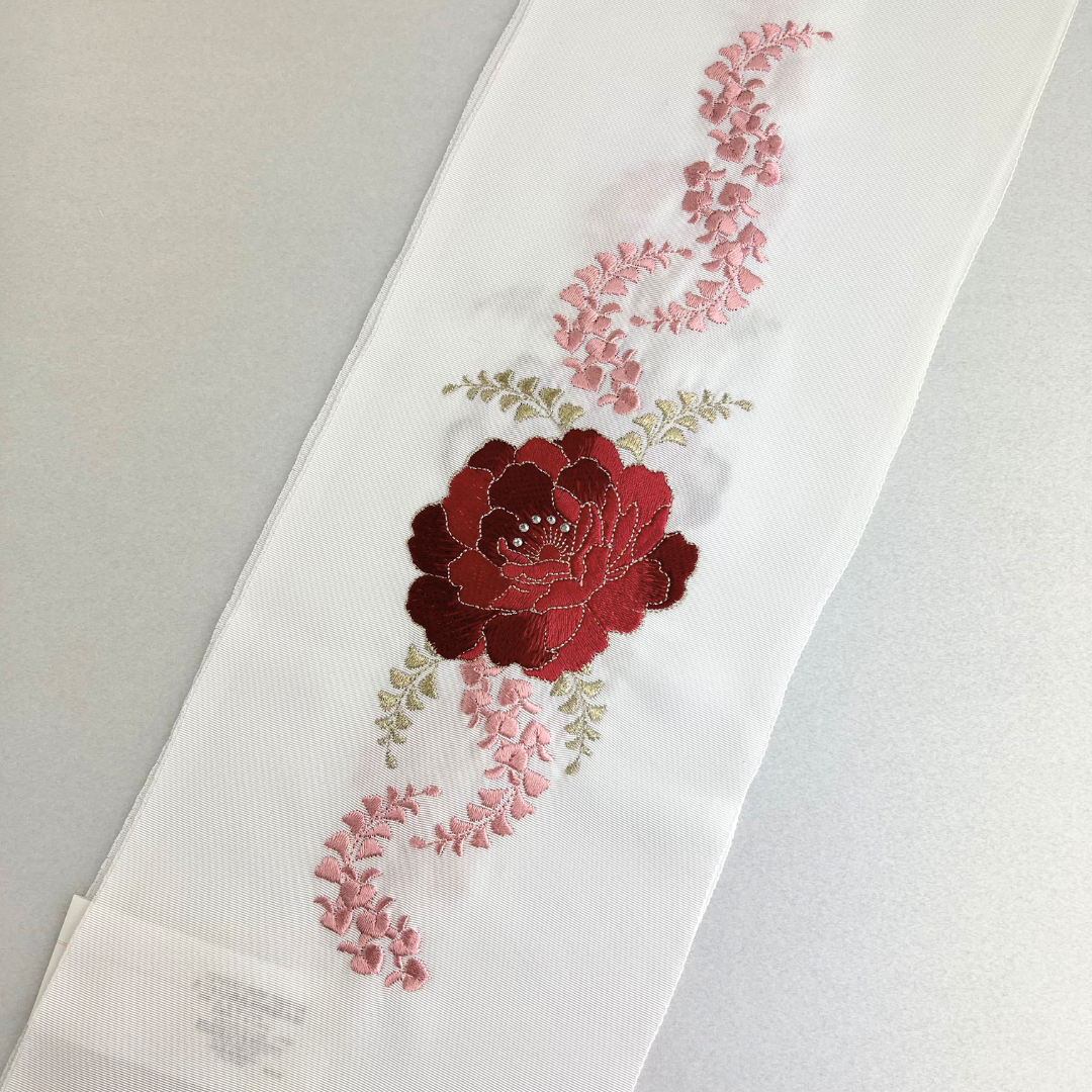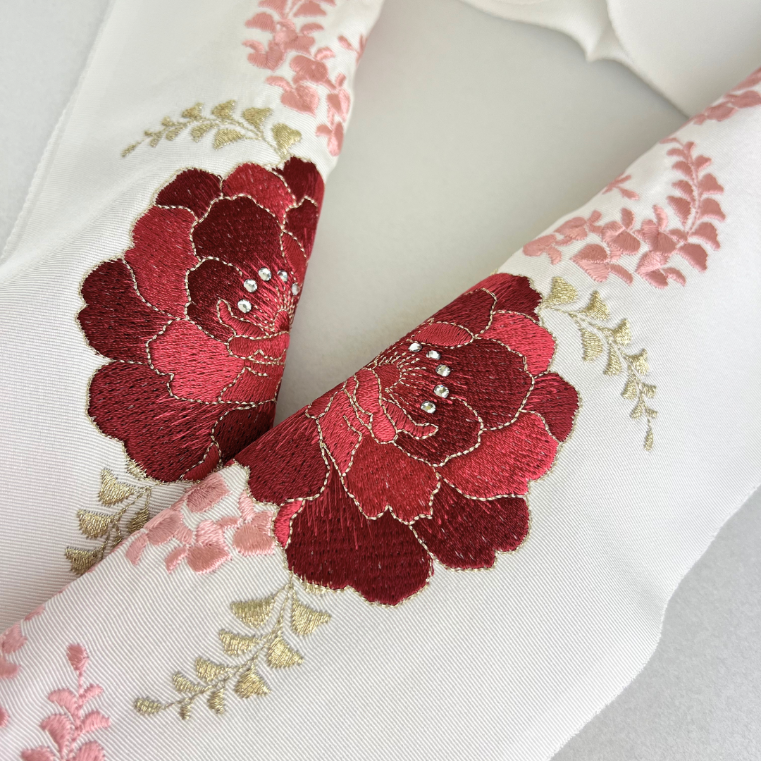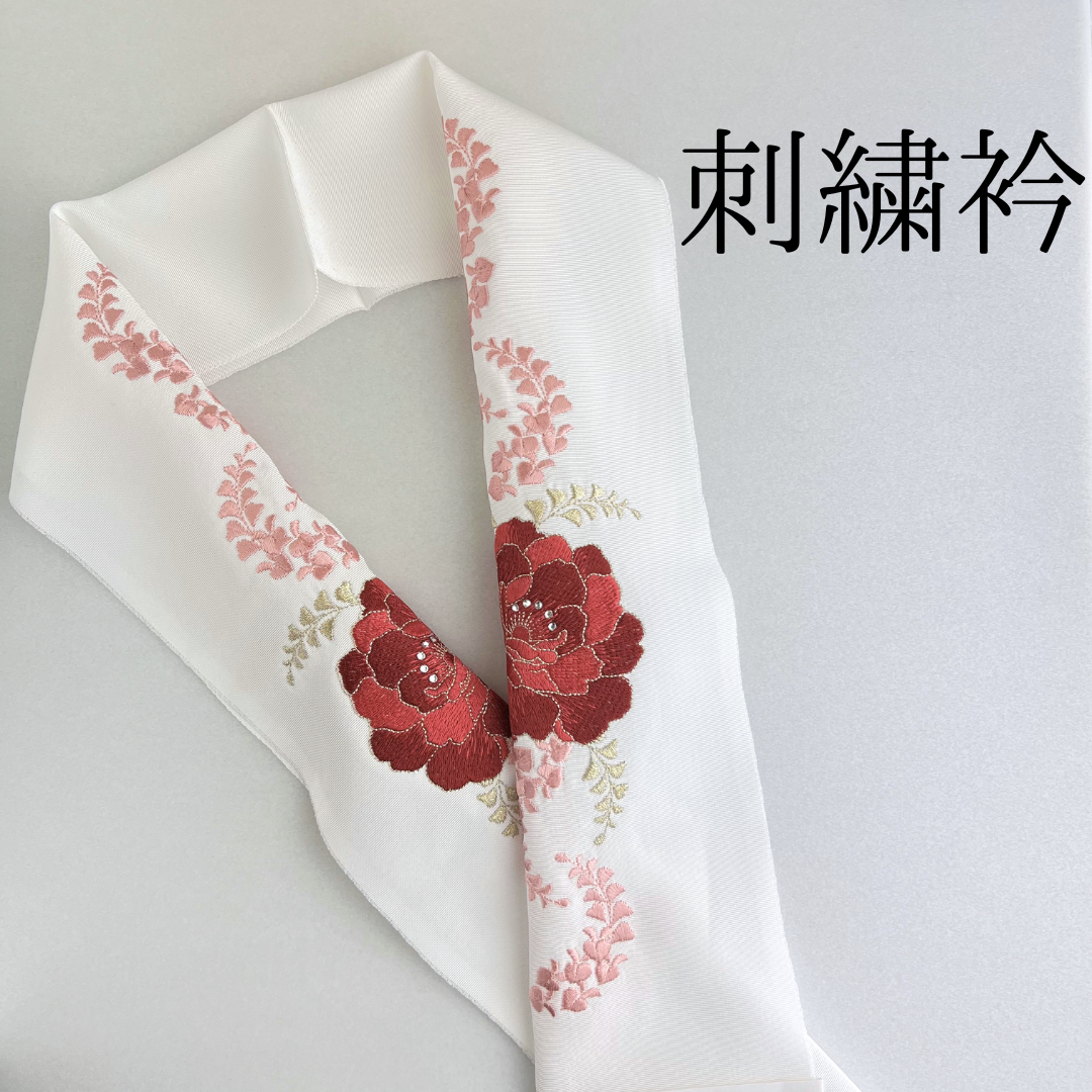 大きい赤色の牡丹が印象的な刺?衿です。ラインストーンが付いているので、お顔周りが華やかに!