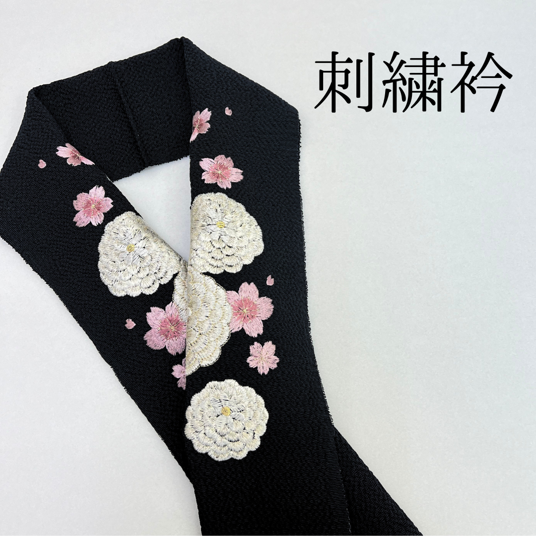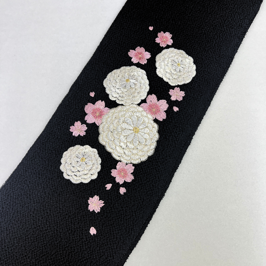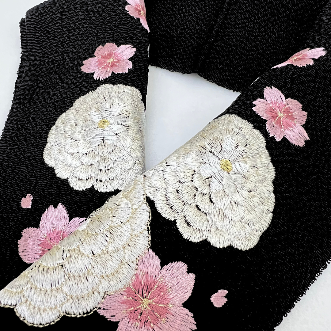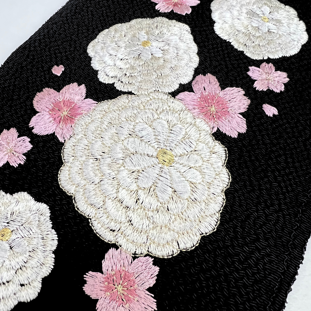 古典的な桜と菊の刺繍で、レトロな雰囲気に。白とピンクの明るい色の刺繍がお顔周りを華やかに!