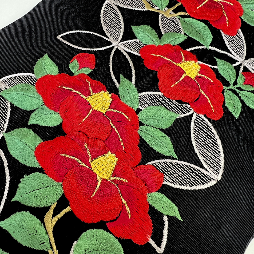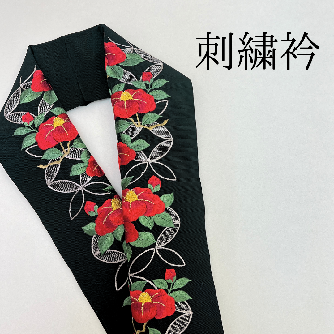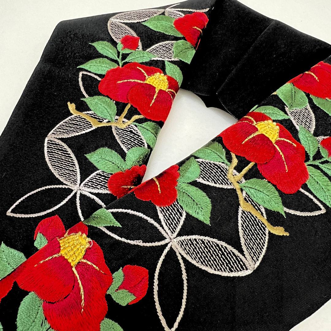 大きい鮮やかな赤色の椿の刺?が、お顔周りを華やかに!レトロな雰囲気にもピッタリです。