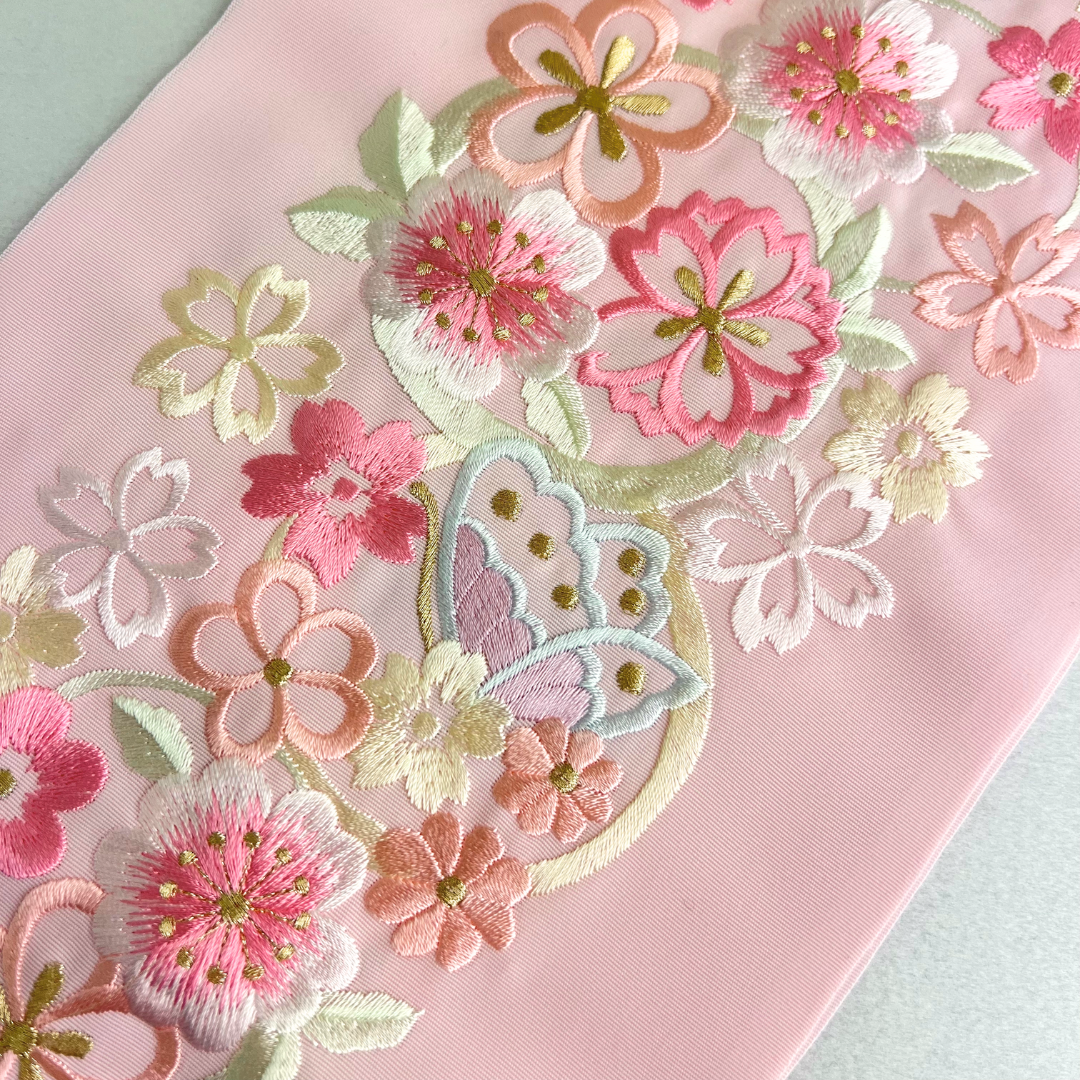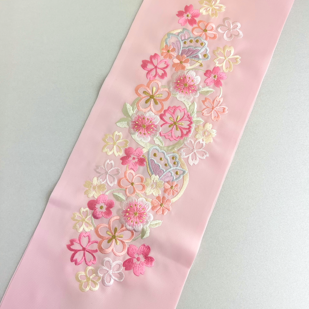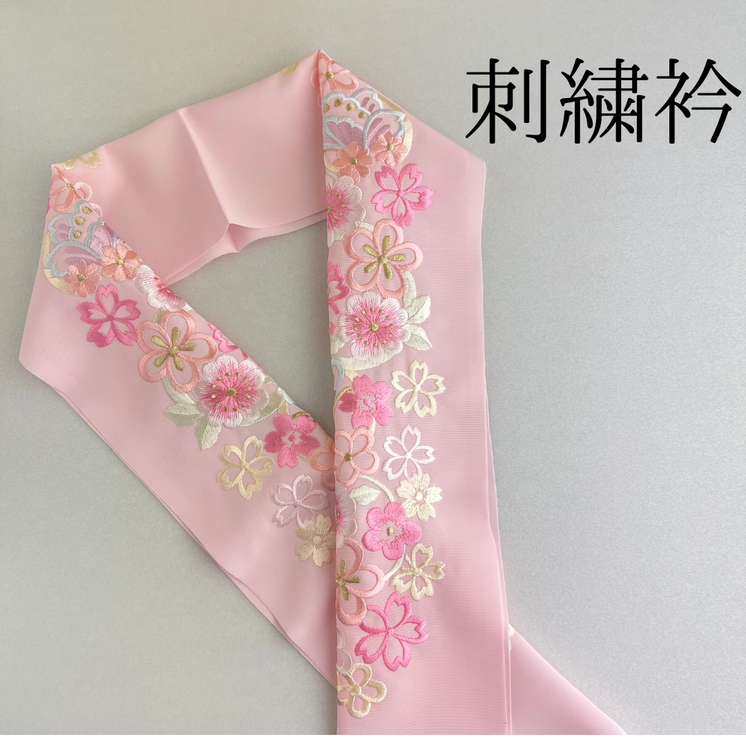 花柄と蝶の刺繍が可愛らしい刺?衿です。淡いピンクが優しい雰囲気にピッタリ!