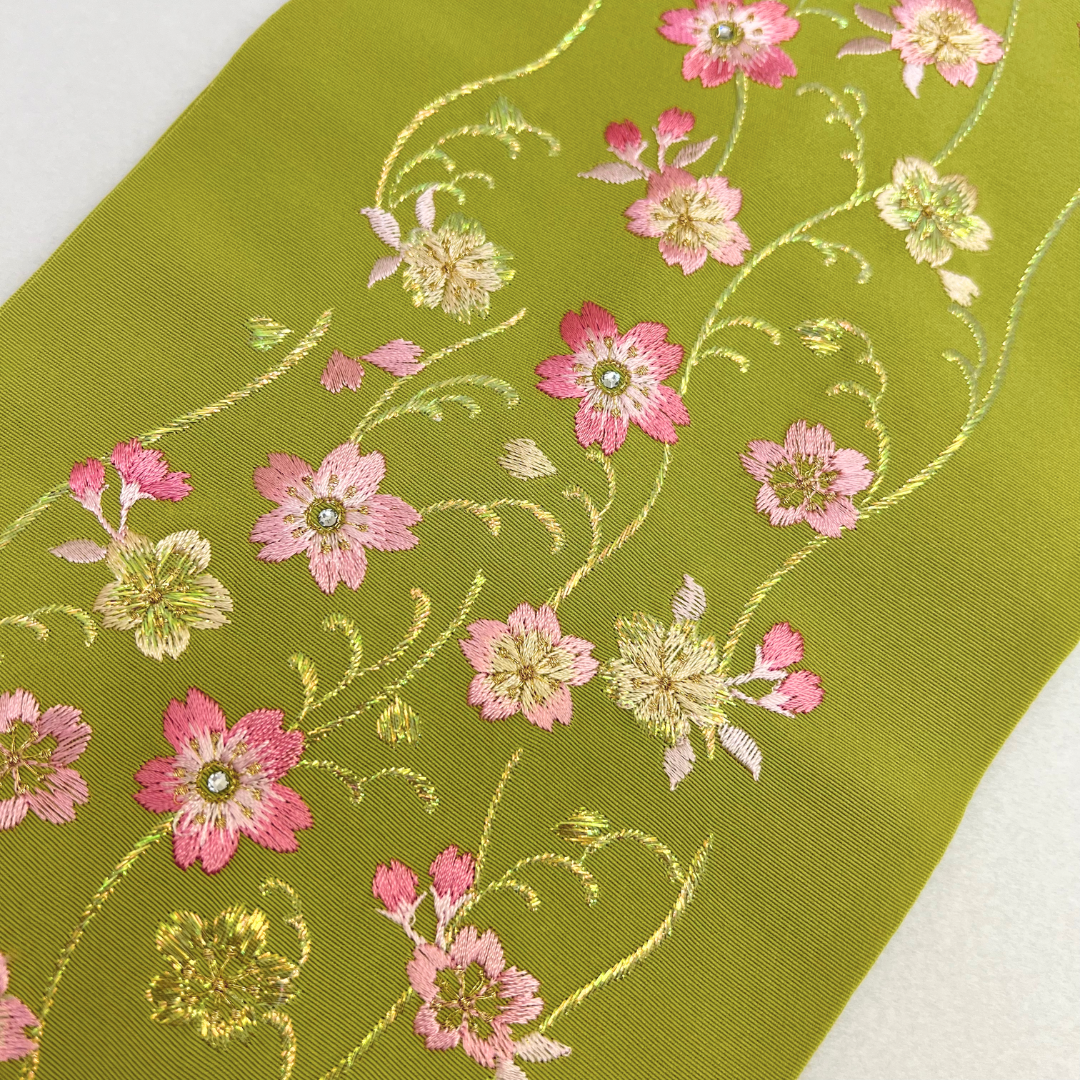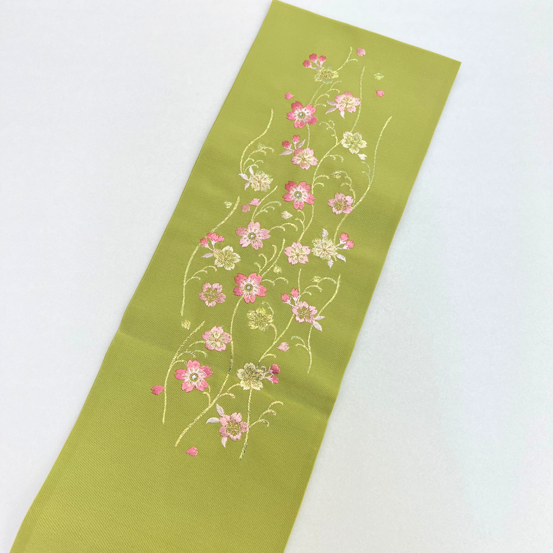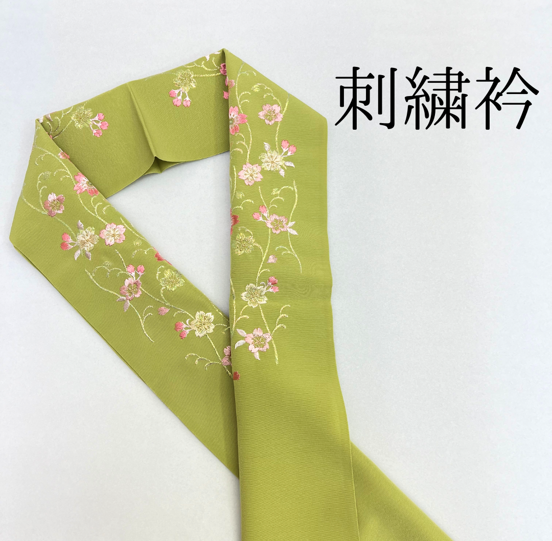 落ち着いた抹茶色と桜の刺繍の組み合わせが、優しい雰囲気の刺?衿です。幅広い着物コーデに合わせやすい、シンプルなデザインです。