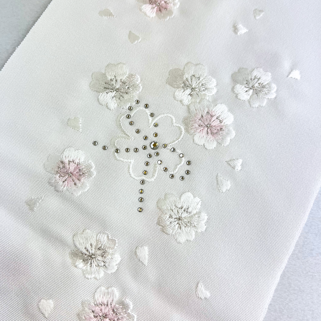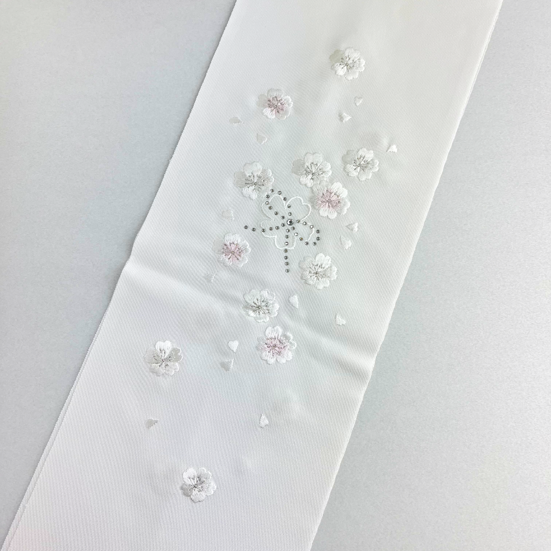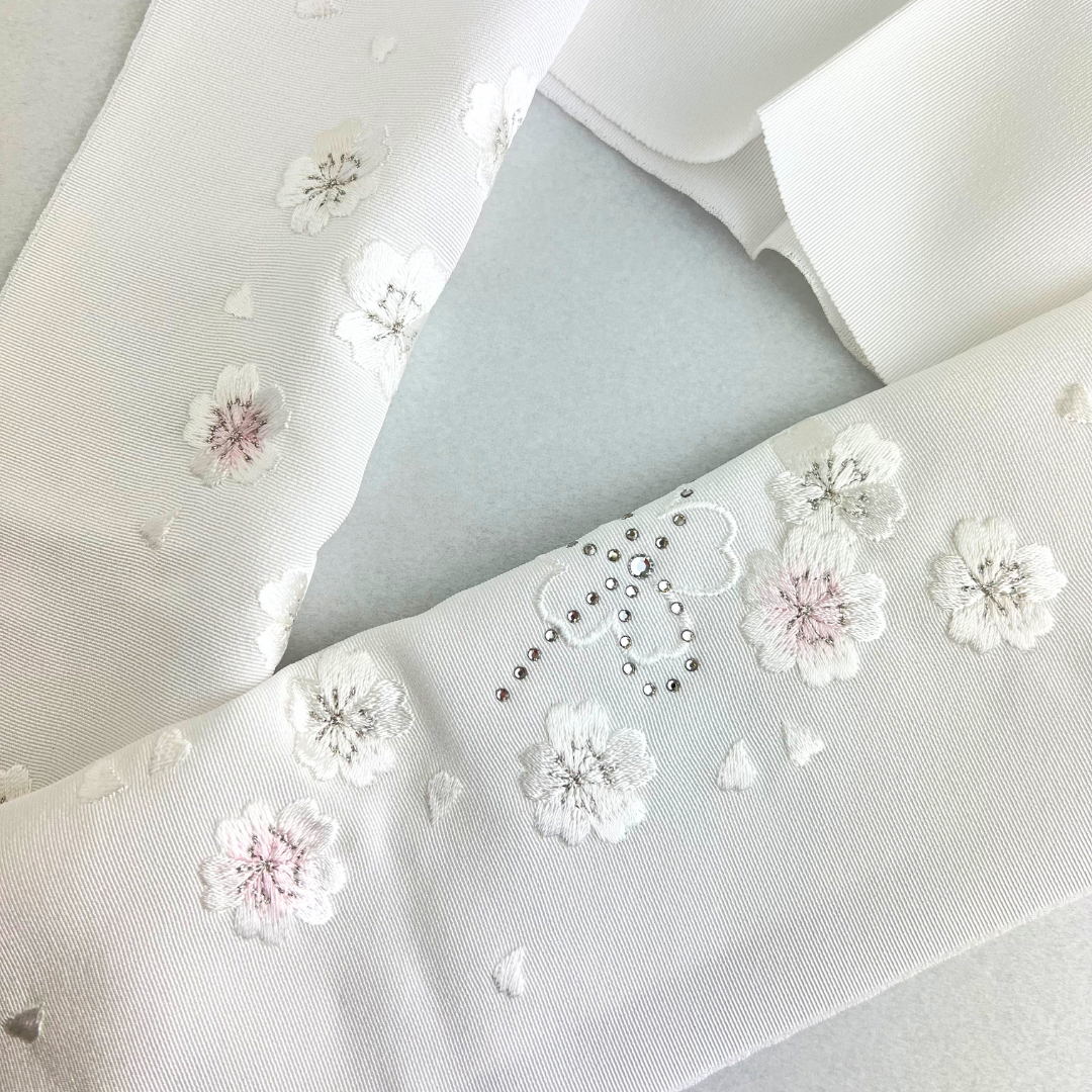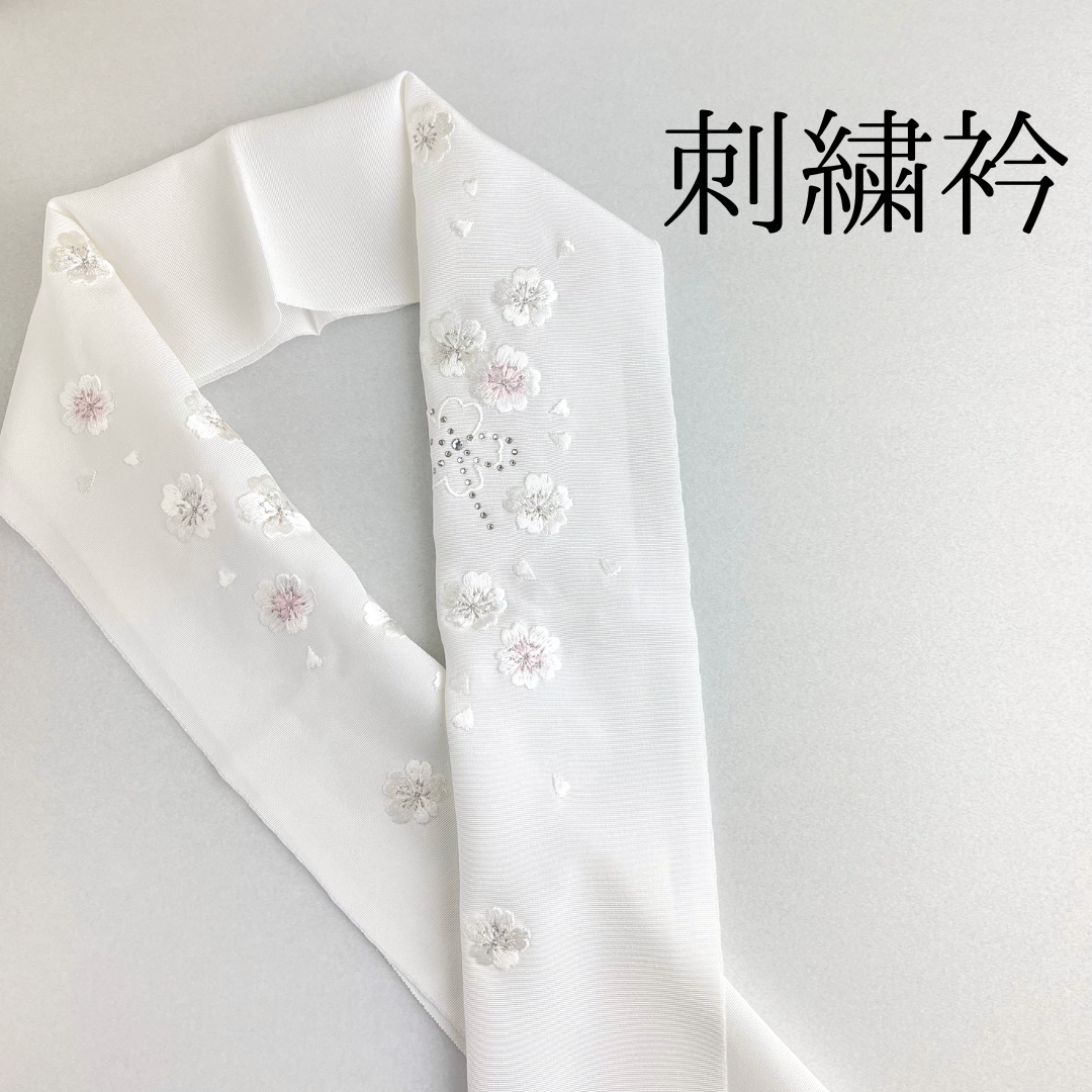 控えめだけど、小花の刺繍とラインストーンのリボンが可愛らしい刺繍衿です。幅広い着物コーデに合わせやすい、シンプルなデザイン!