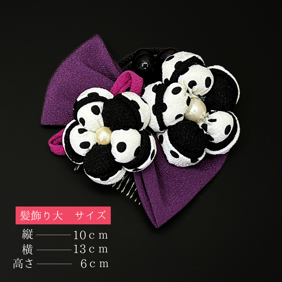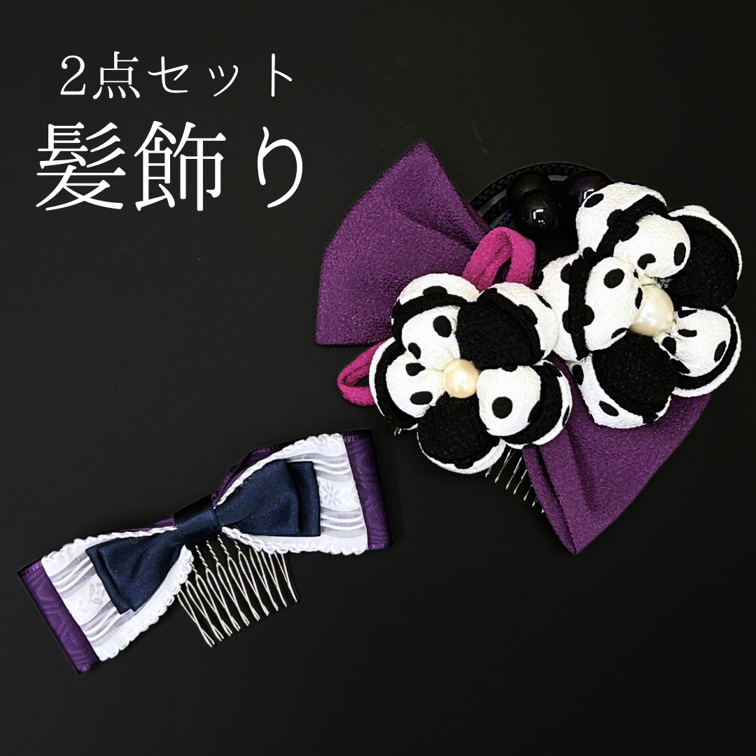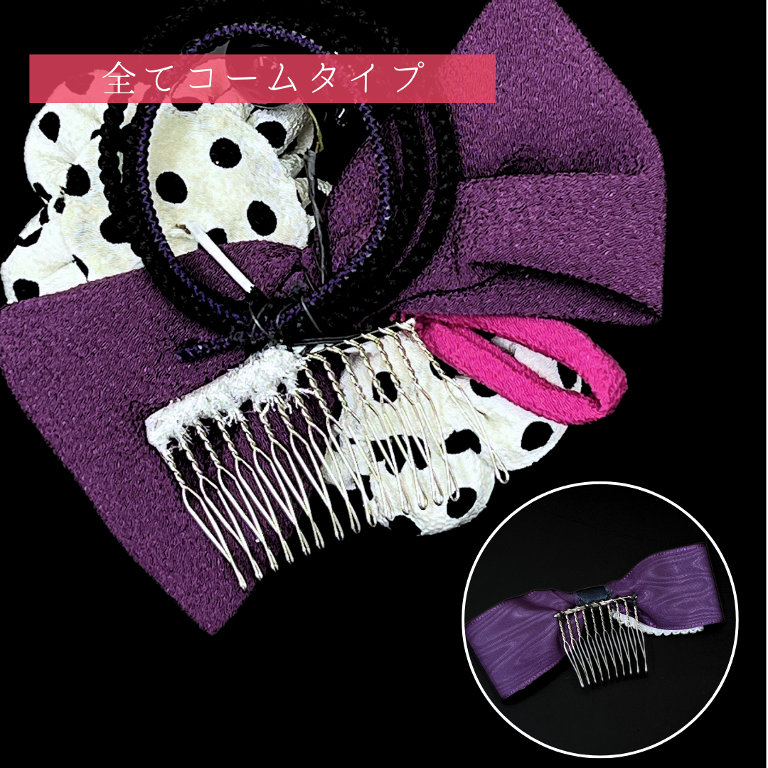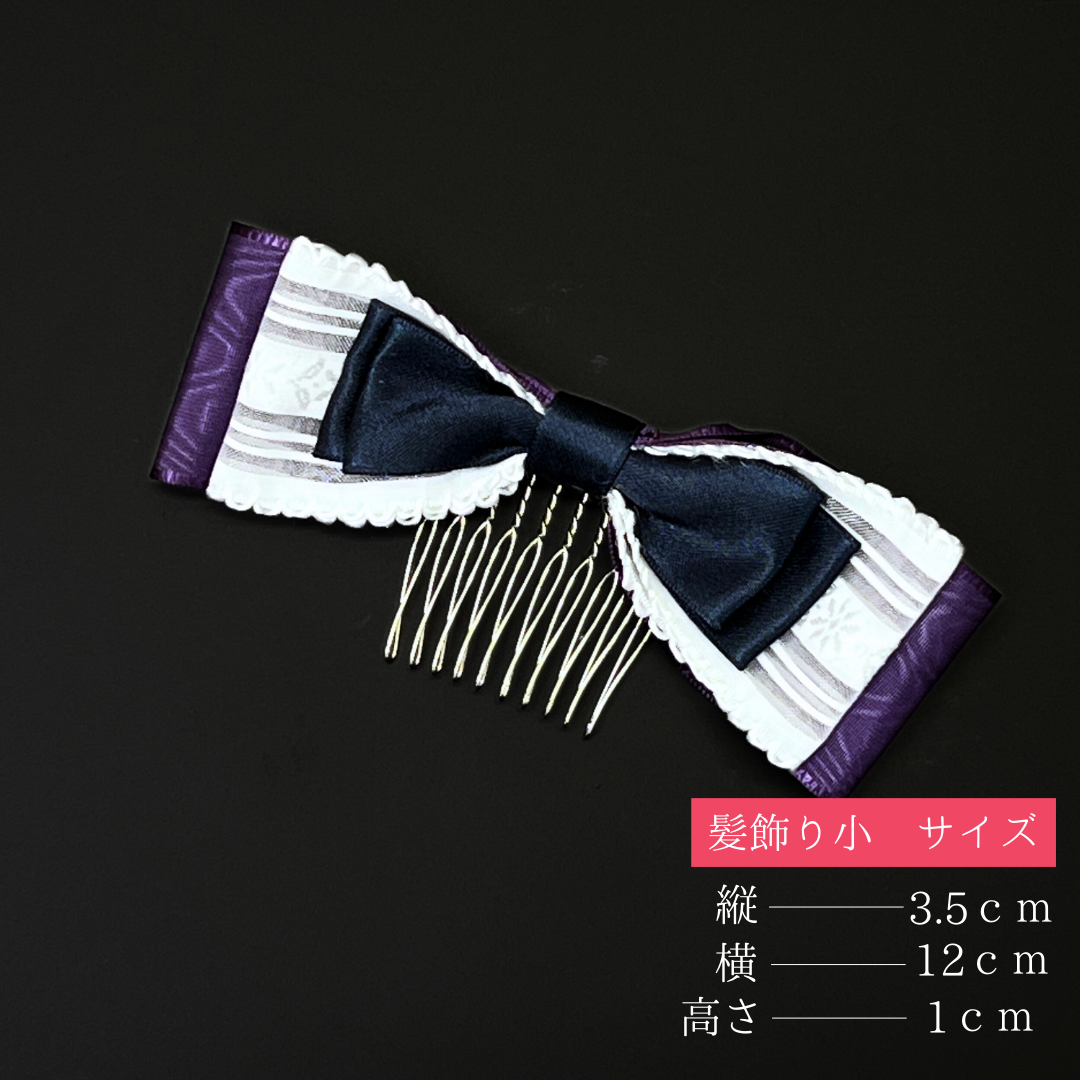 落ち着いた紫色の大小のリボンが、大人っぽさの中に可愛らしさのある髪飾りです。