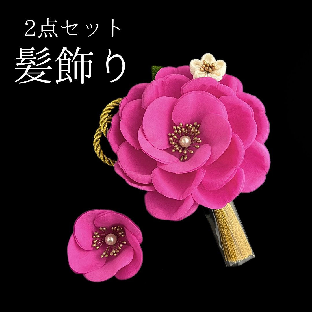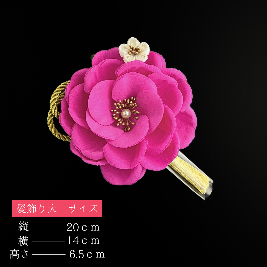 鮮やかなピンク色の大きいお花が印象的なゴージャスな髪飾りです。
