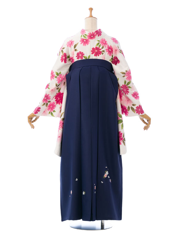 ■着物: 白地 洋花■袴:紺袴 桜刺繍 99cm