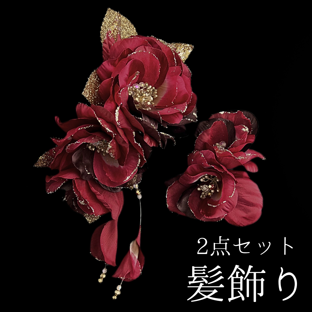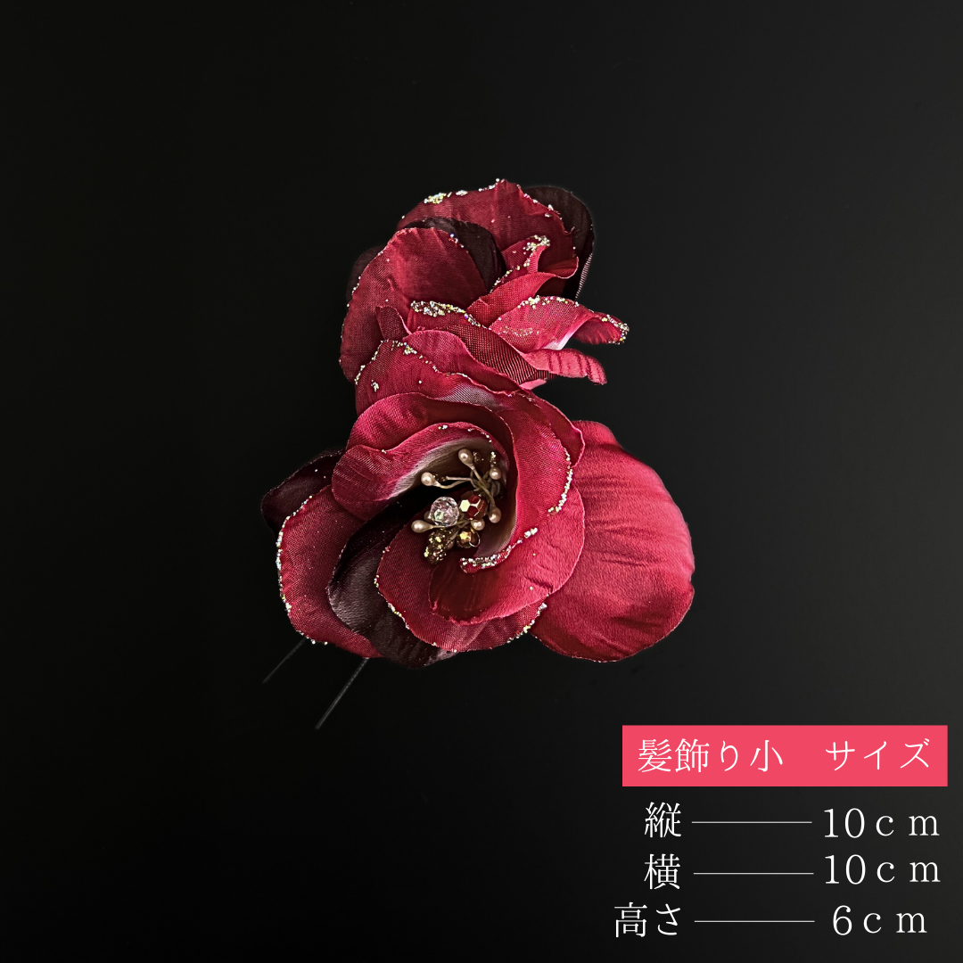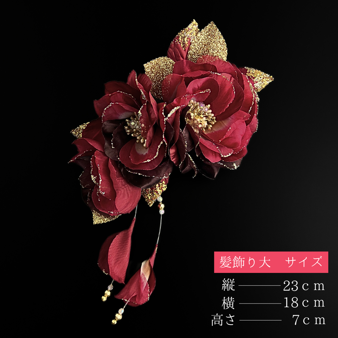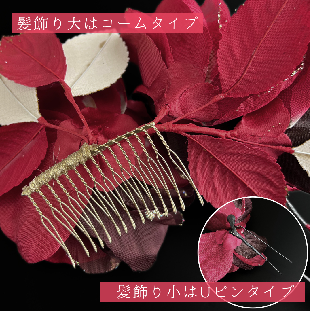 【商品情報】サイズ髪飾り大:縦約23cm×横約18cm×高さ約7cm(コーム仕様)髪飾り小:縦約10cm×横約10cm×高さ約6cm(Uピン仕様)