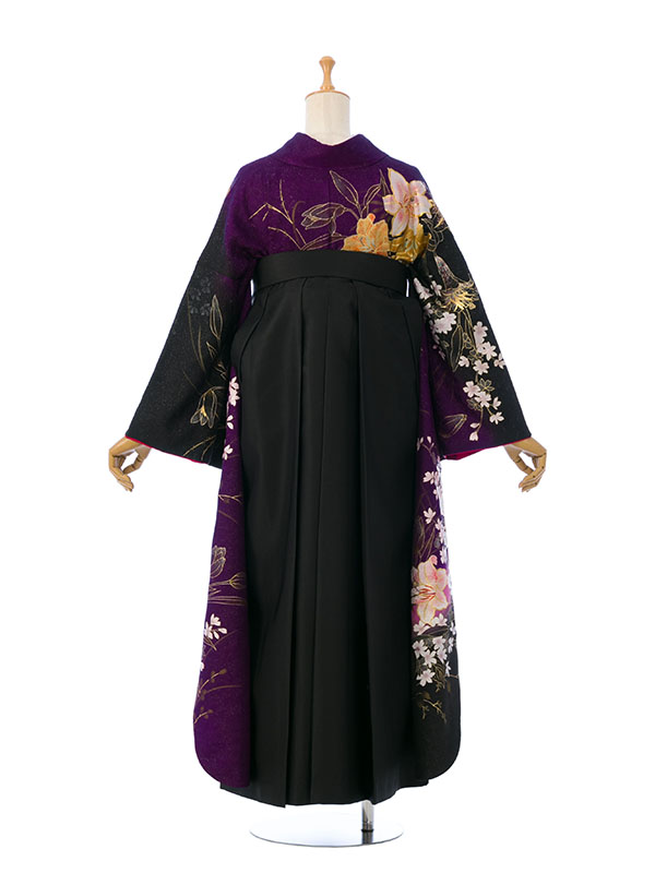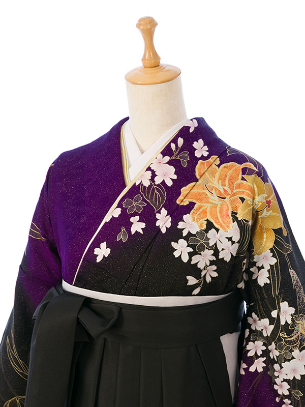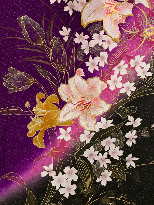 ■着物: 紫ラメ織地 黒ぼかし カサブランカに蘭花 金彩