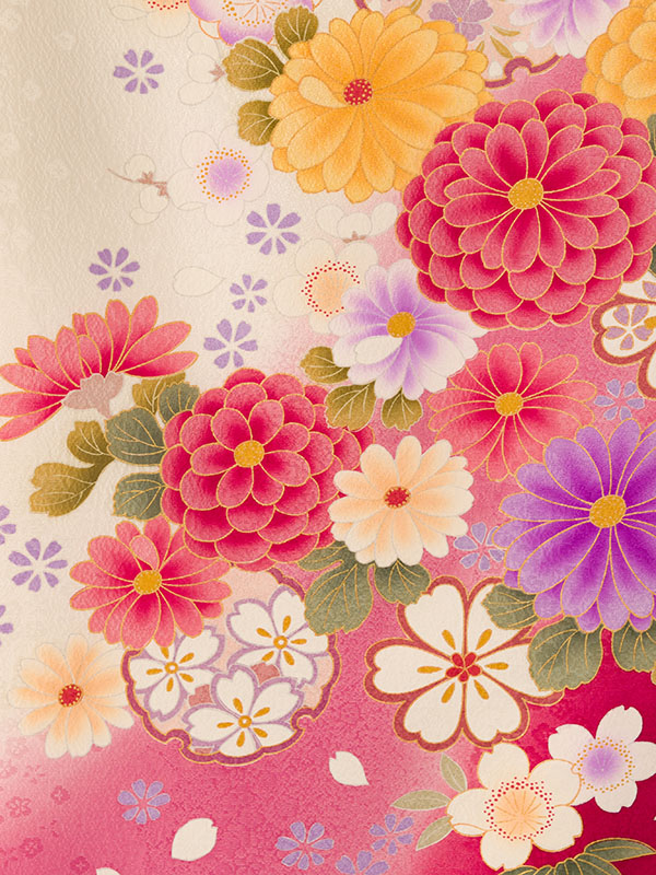■着物: 白地 裾ピンク 雪輪に四季草花