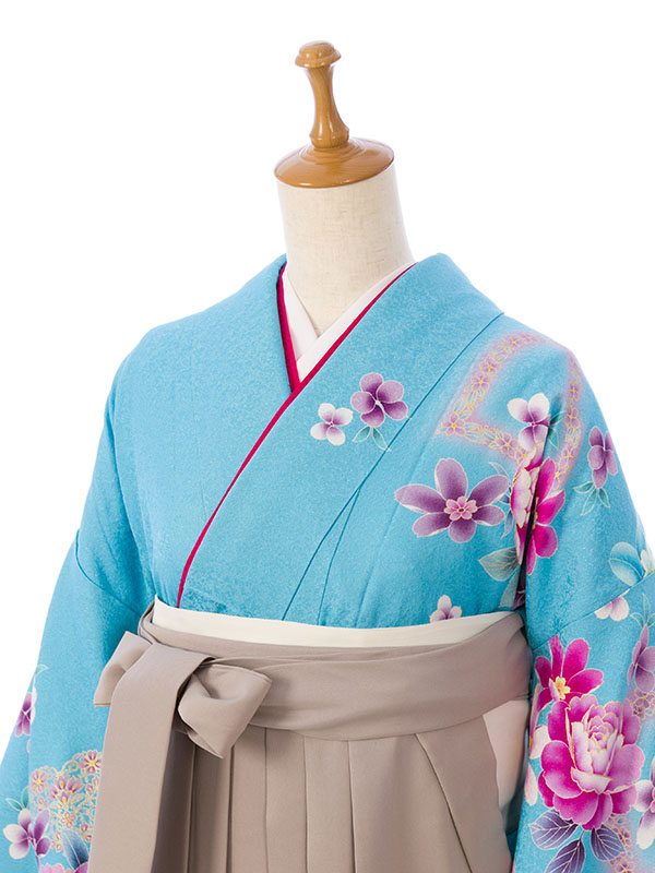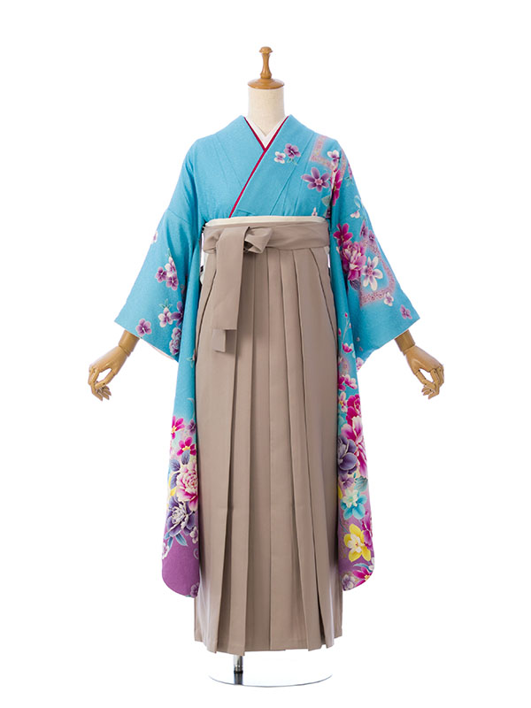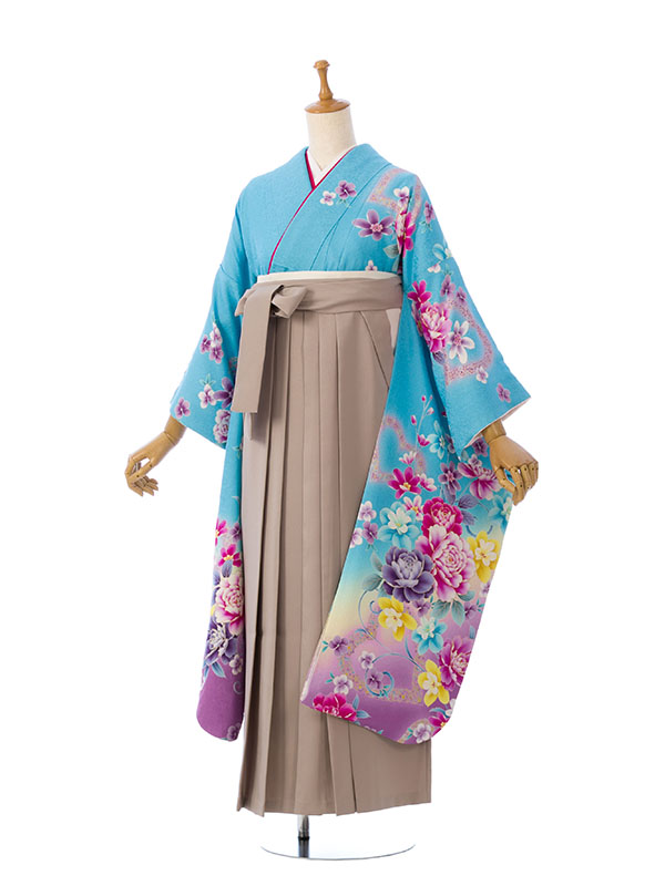 ■着物: 水色ラメ織地 裾紫ぼかし/ハートに洋花 金彩