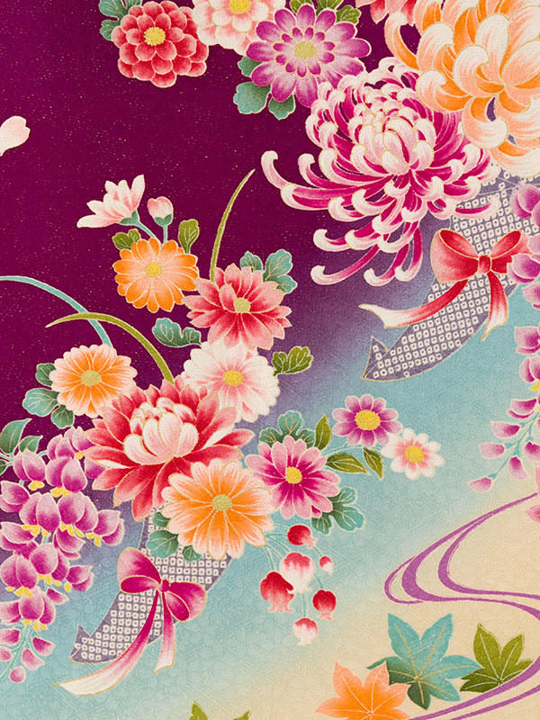 ■着物: 紫地ラメ織 水色ぼかし 裾クリーム 四季花に流水