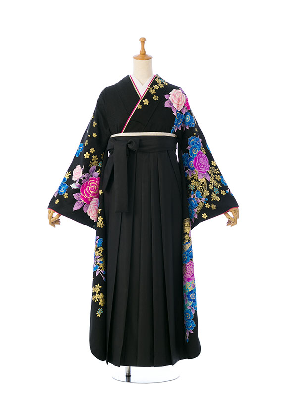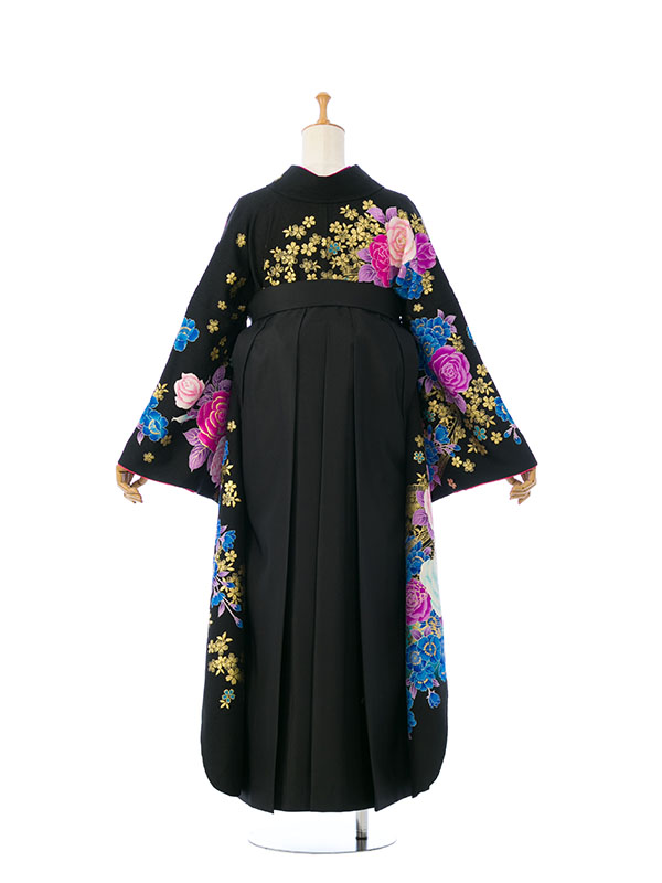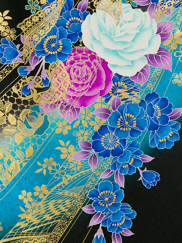■着物: 黒/青地 レース 薔薇 金彩