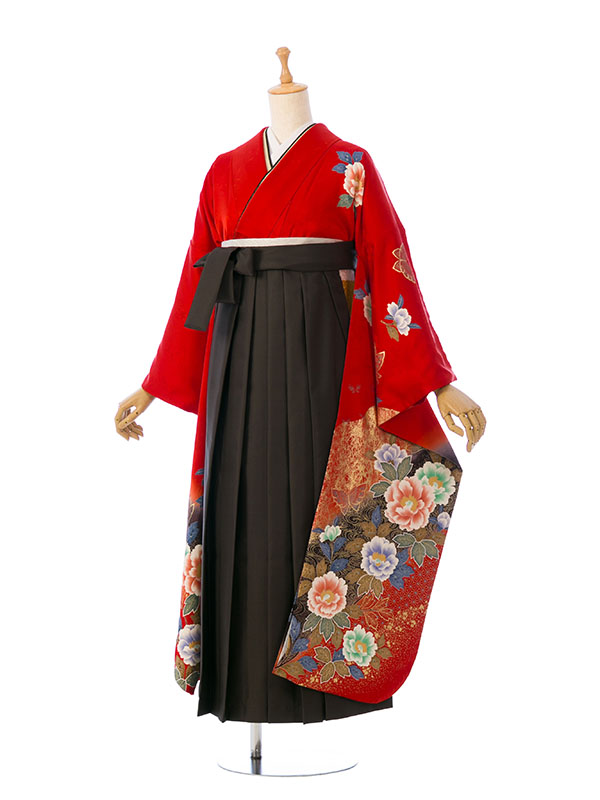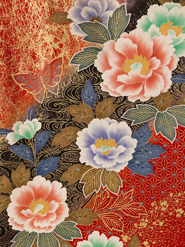 ■着物: 赤 桜地紋 牡丹 蝶 金彩