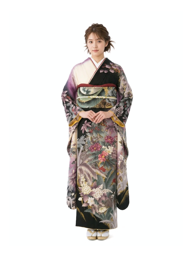 振袖|黒系|洋花|4S409|対応身長:150-160cm|サイズ:7号-13号